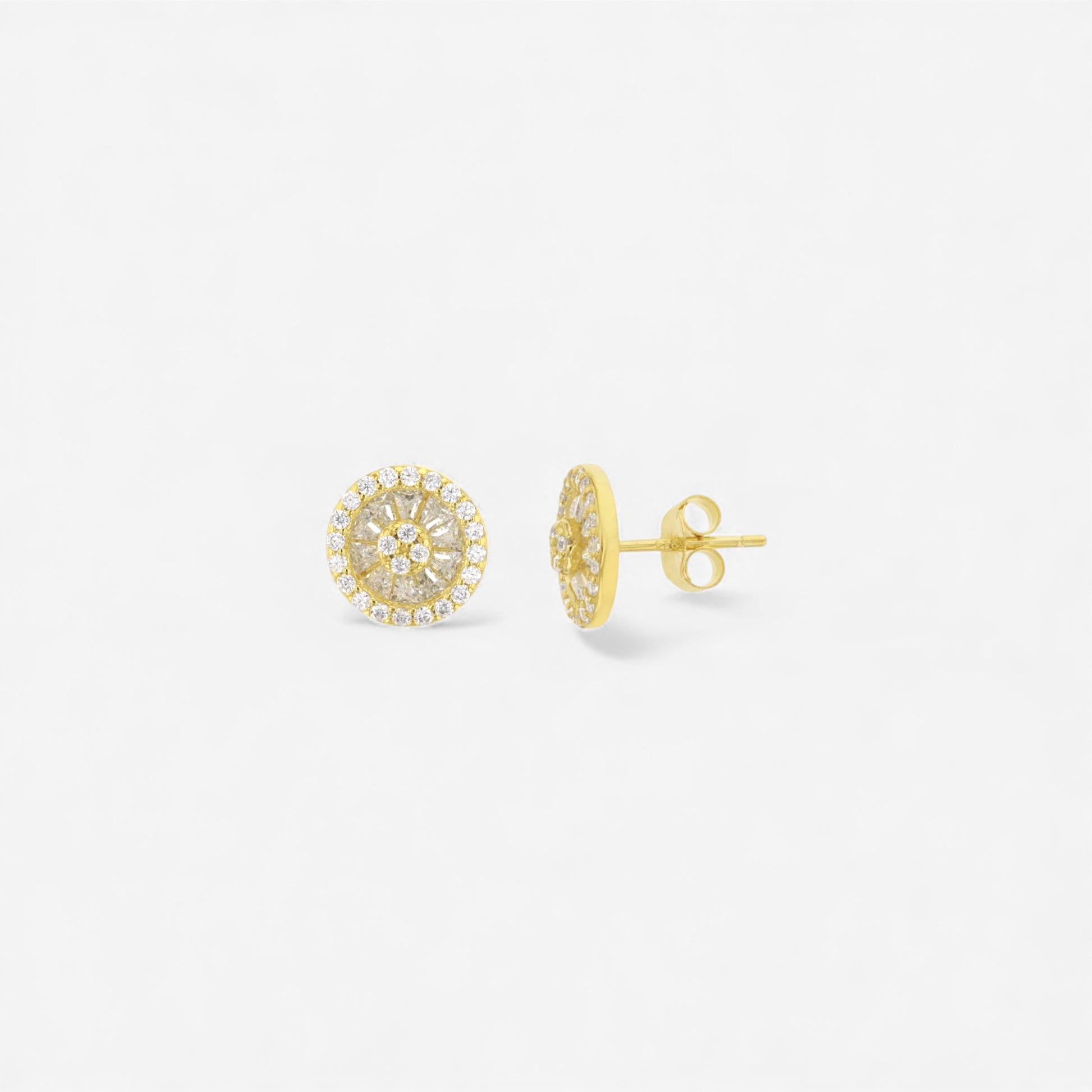 Gold vermeil round studs with a round/ baguette halo. When ya need a lil sparkle on the basics.