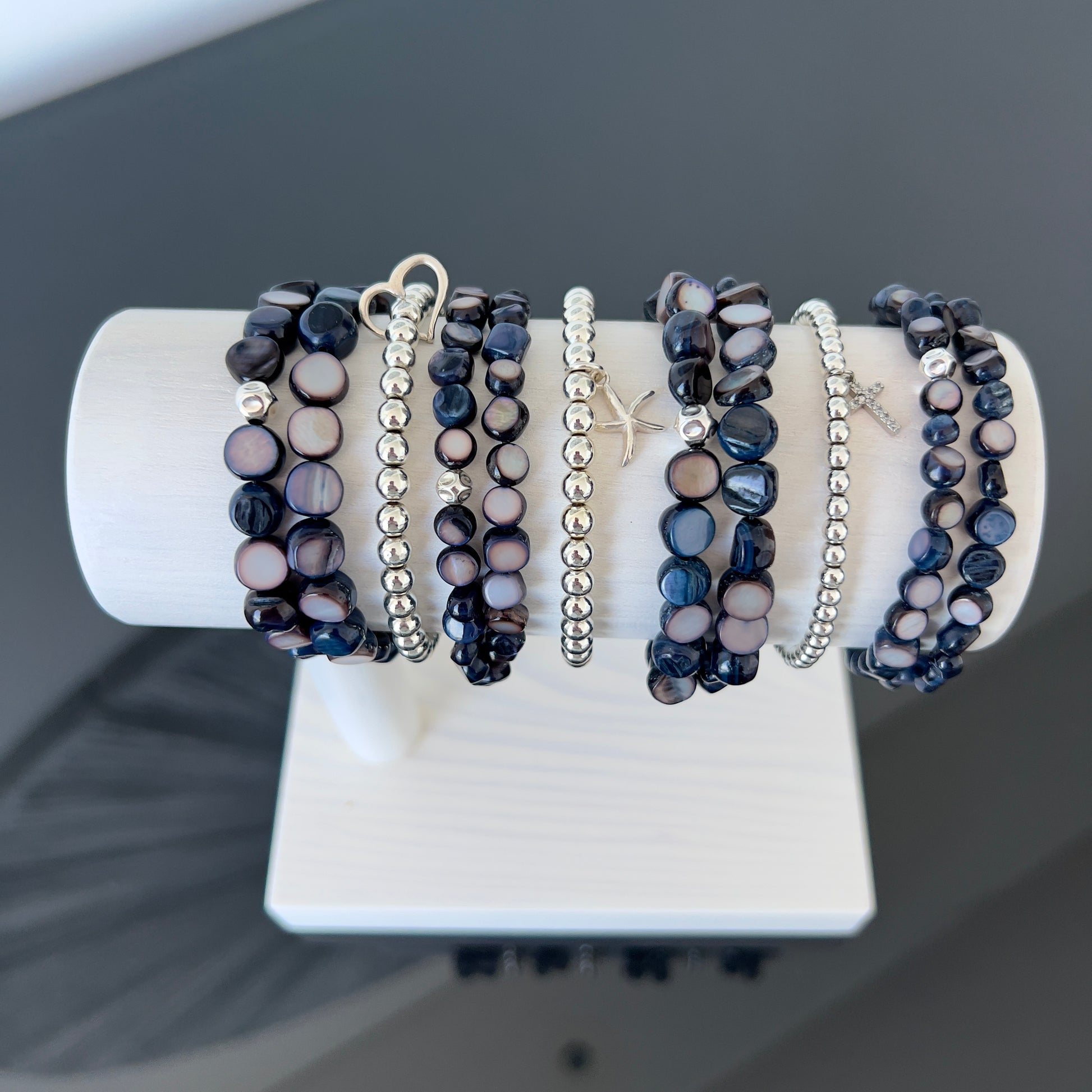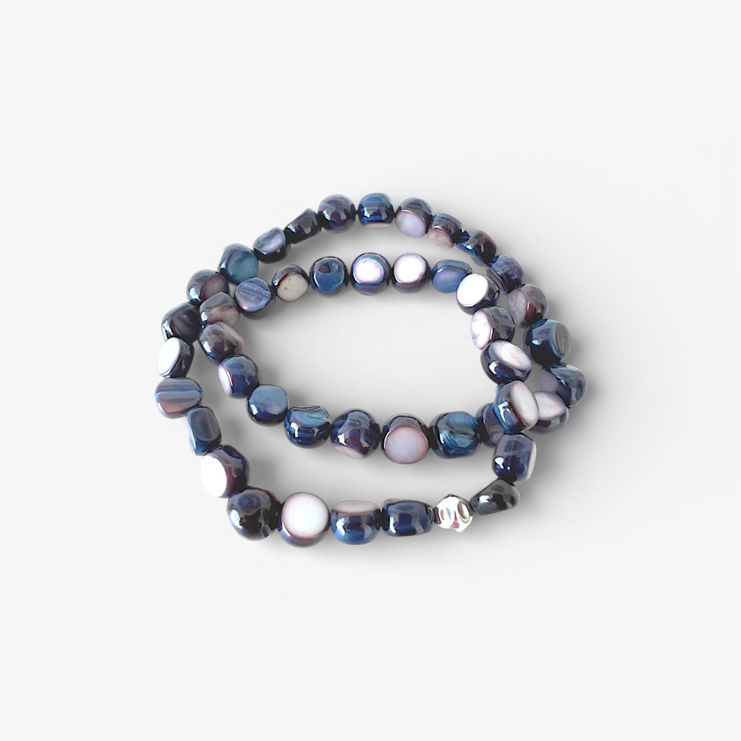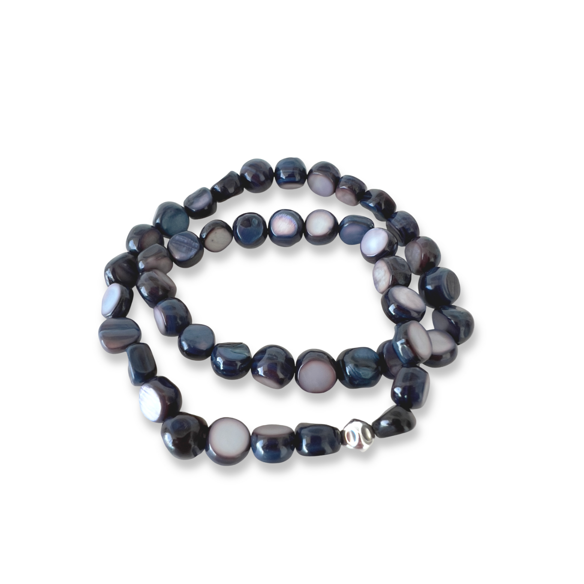 This unique double wrap bracelet is made with 8mm +/- blackish- blue Mother of Pearl shell beads and a 6mm Sterling Silver accent bead.