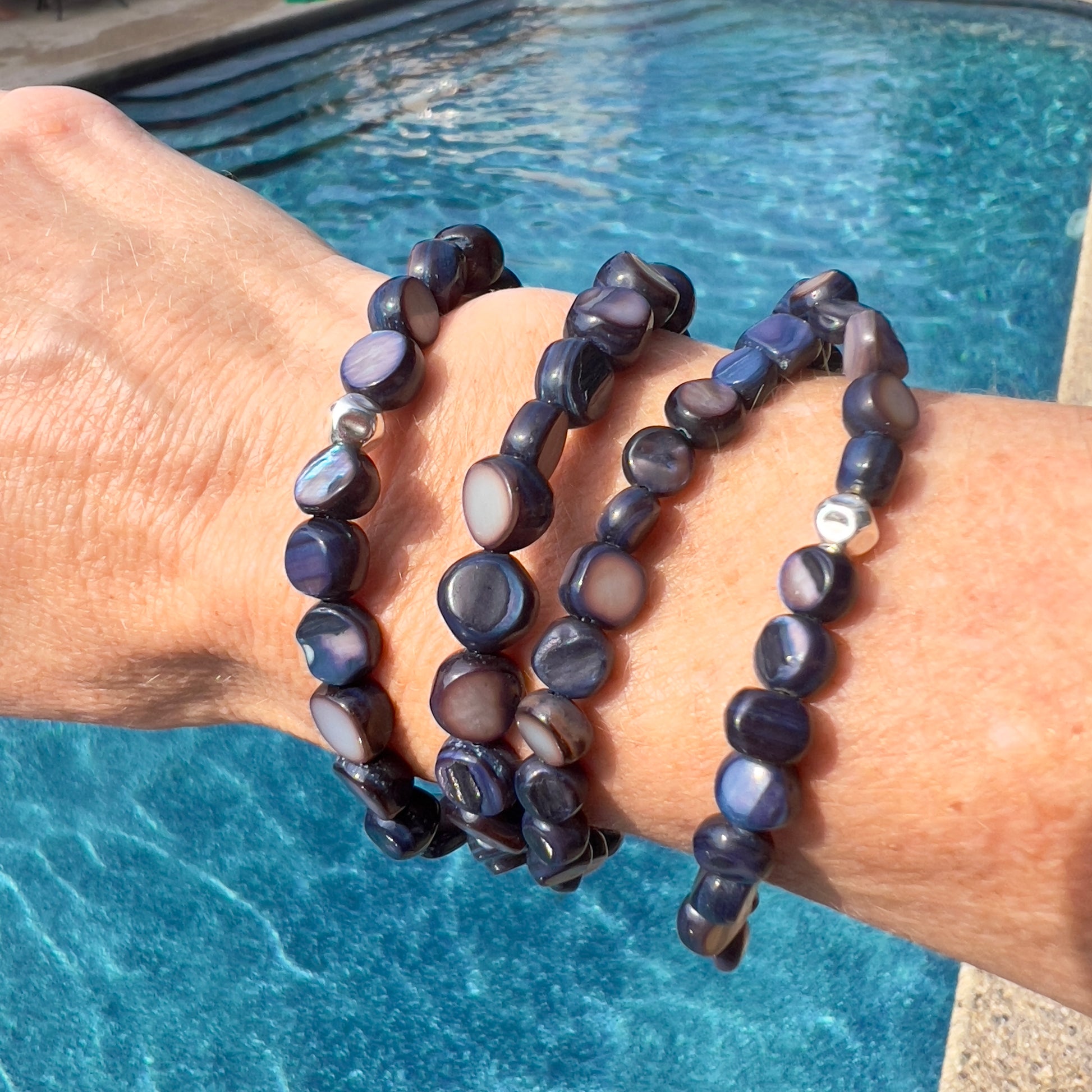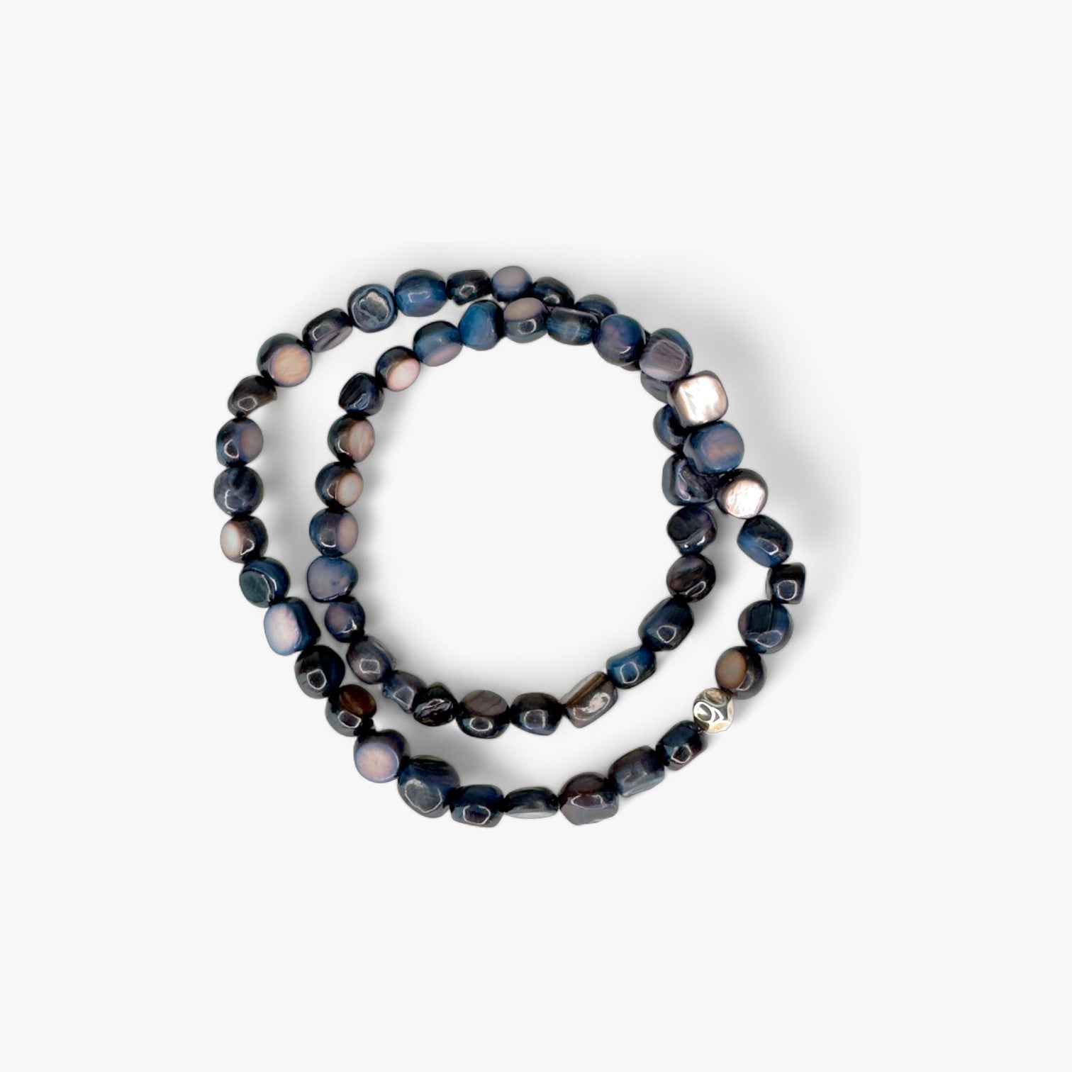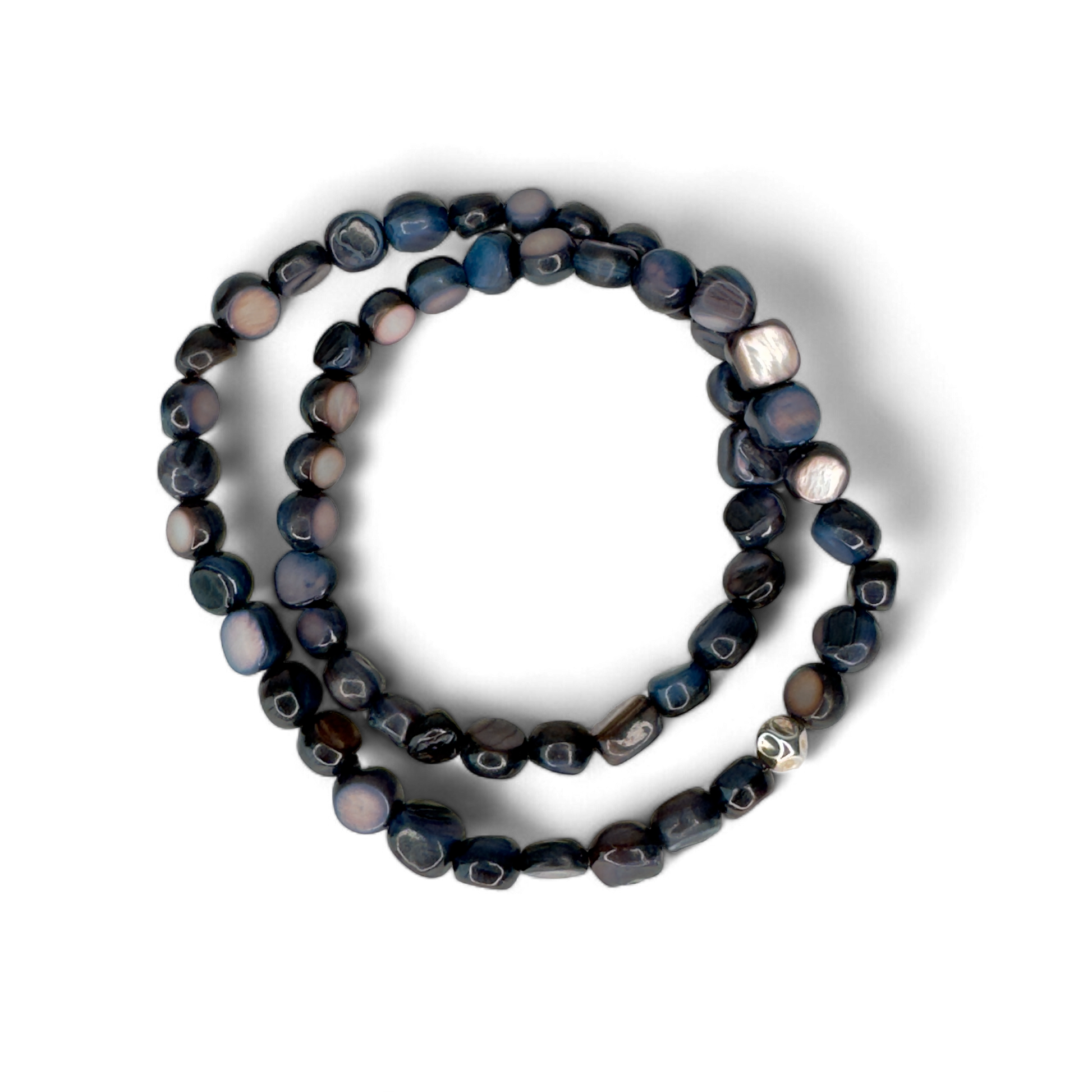 This unique double wrap bracelet is made with 6mm blackish- blue Mother of Pearl shell beads and a 5mm Sterling Silver accent bead.