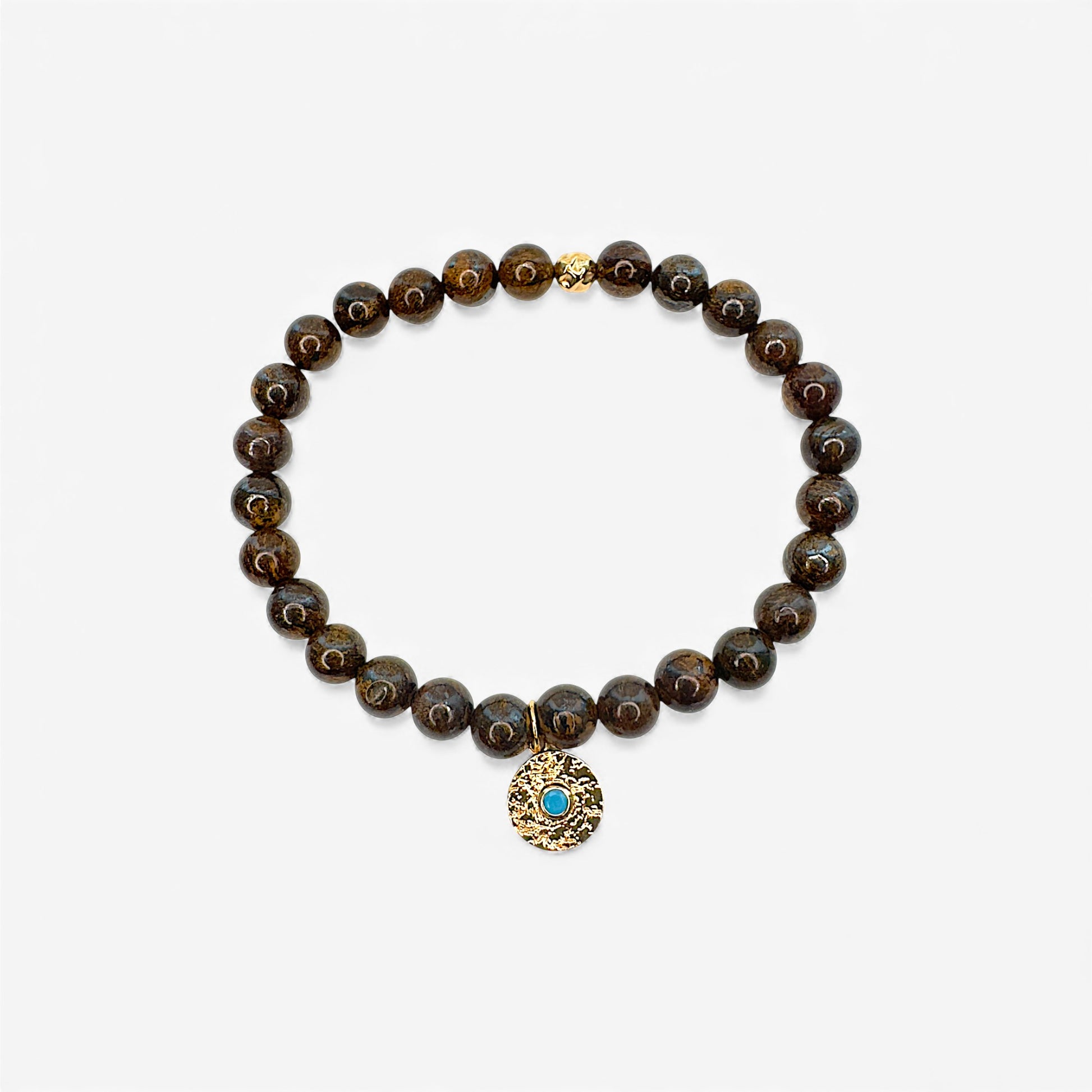 6mm bronzite round beads and a gold charm with turquoise center stone