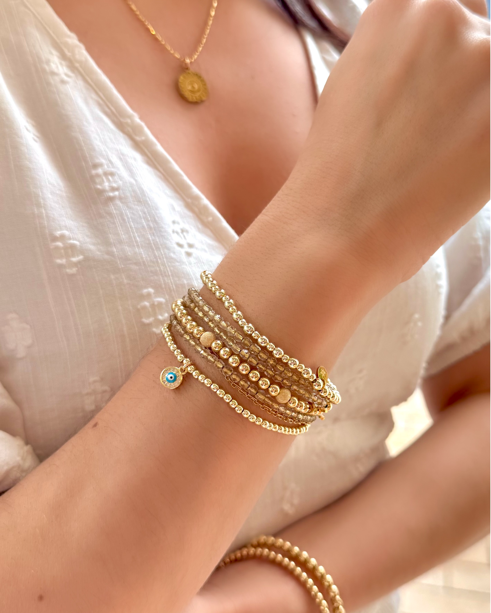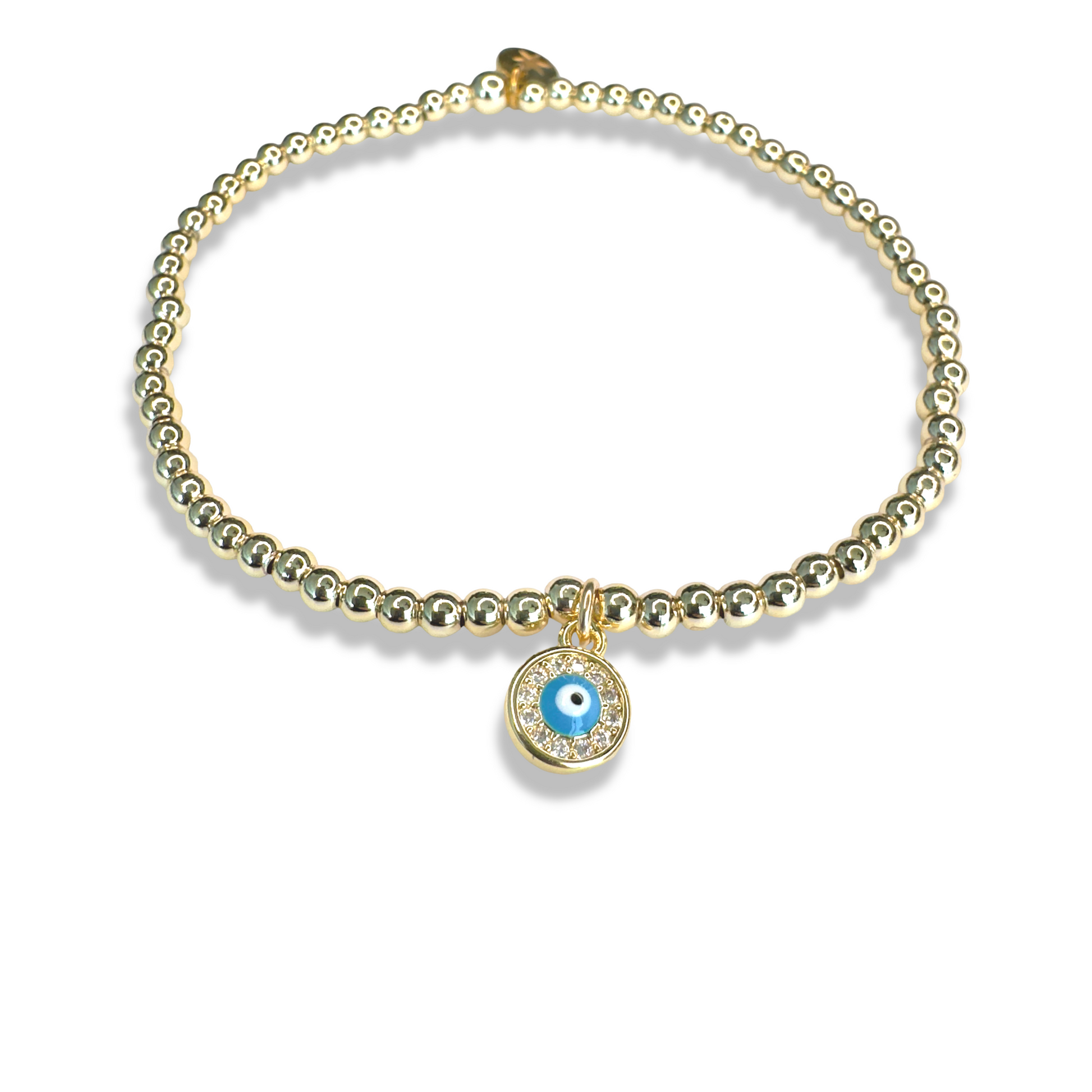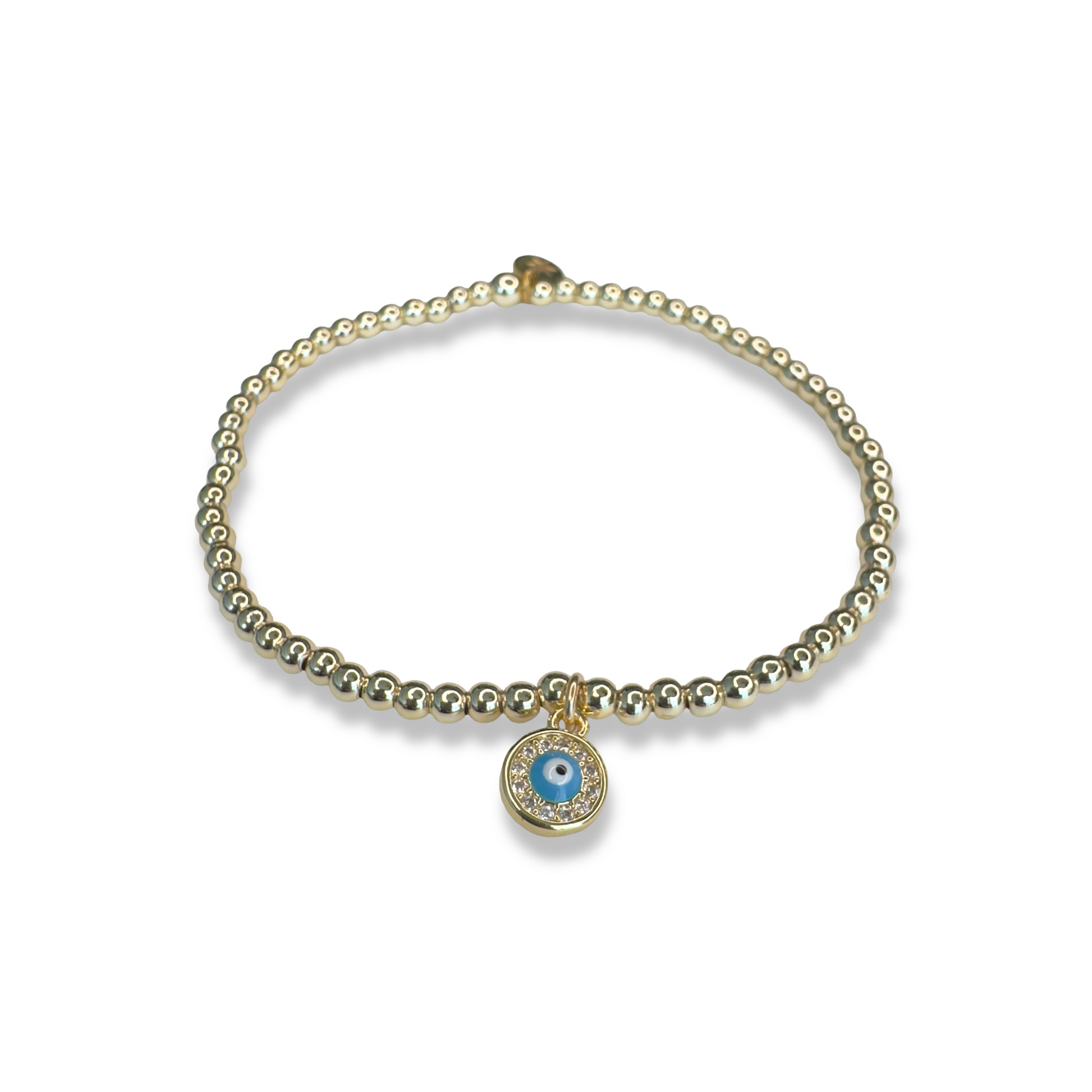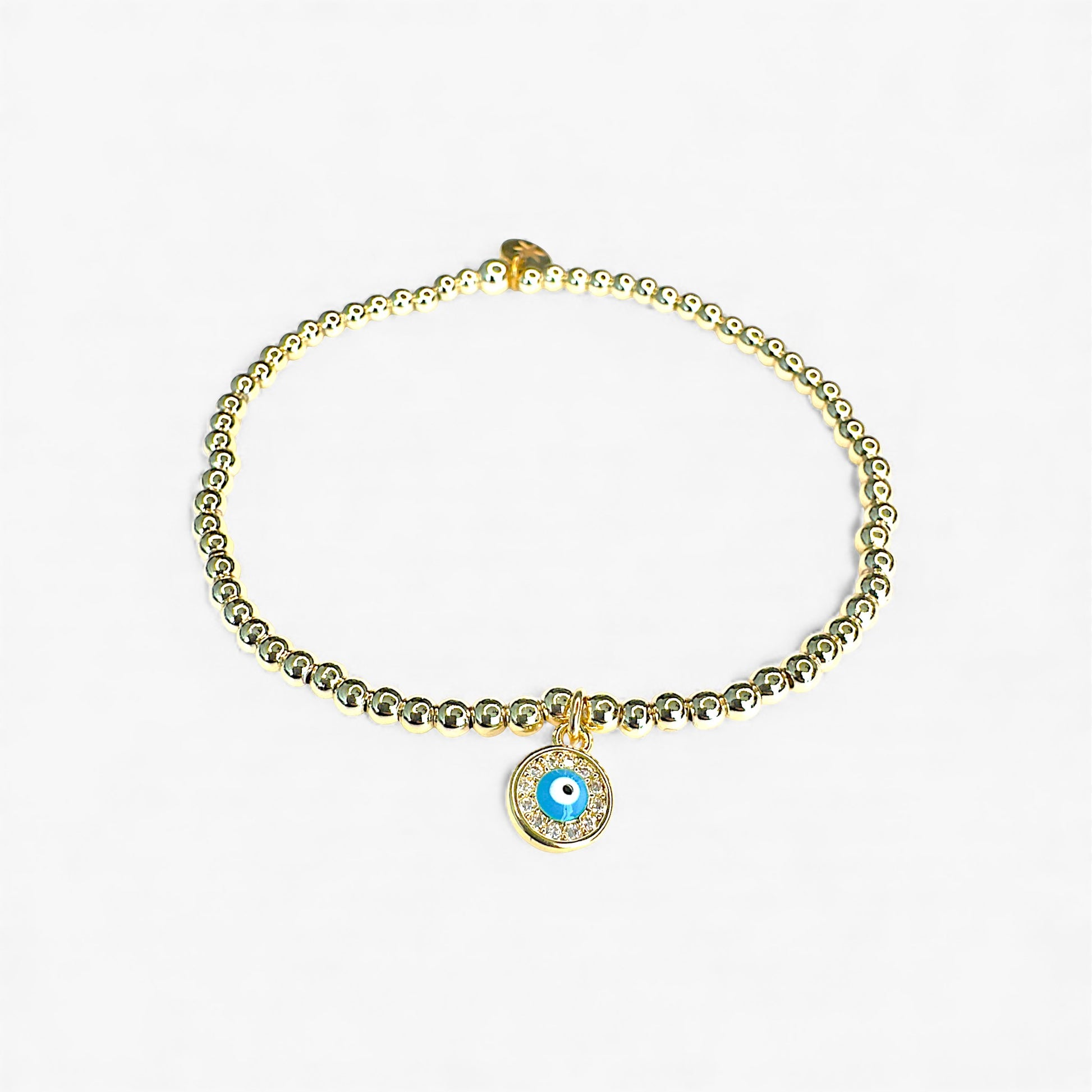 3mm gold plated beaded bracelet with a delicate CZ micro pave evil eye charm