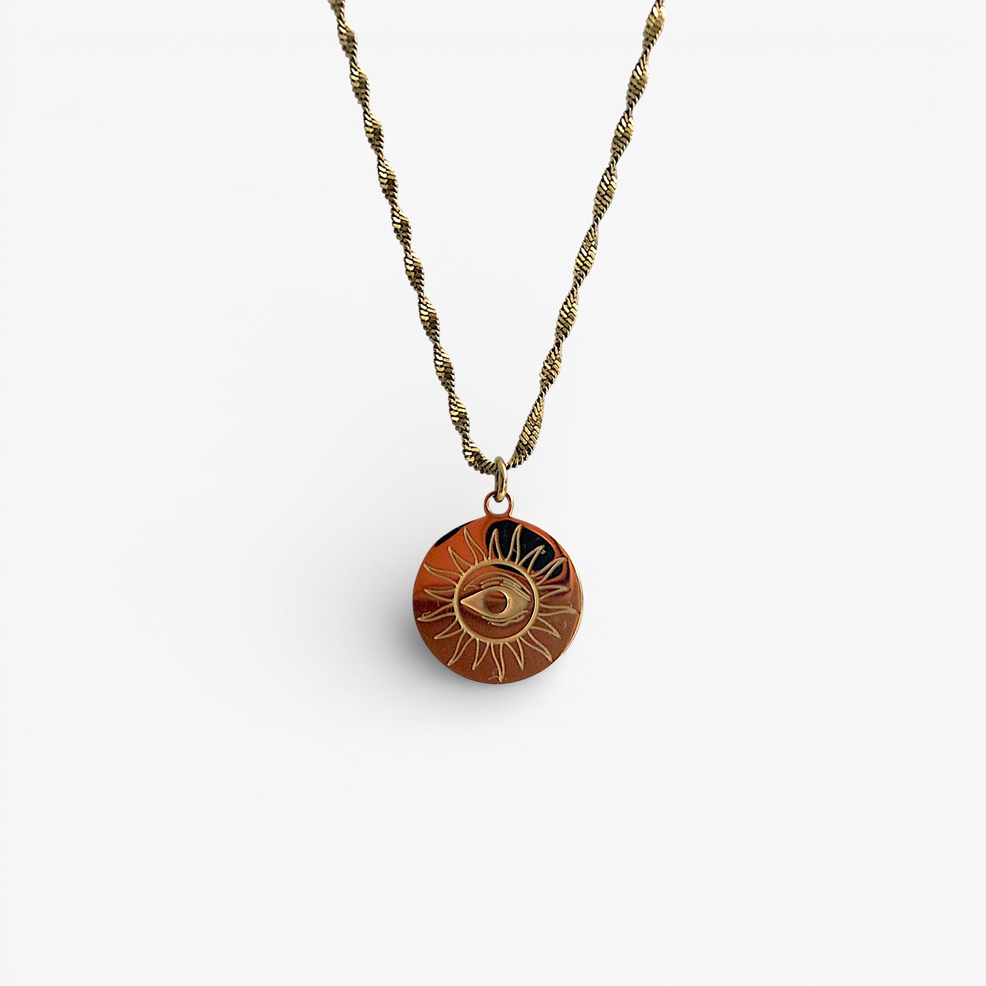 Gold plated circular sun + evil eye charm on an 18k gold plated Singapore chain, 18" with a 2" extender, PVD stainless steel
