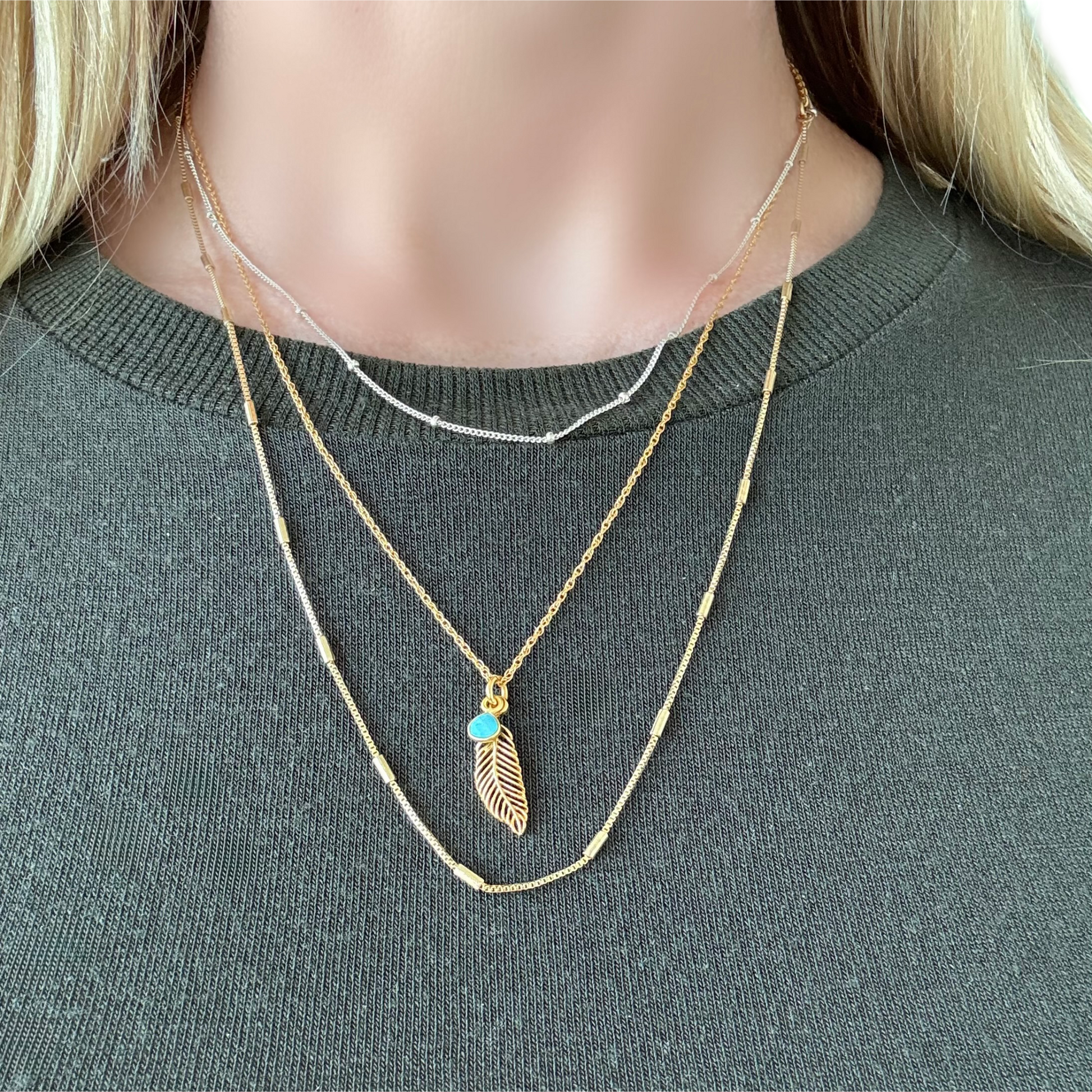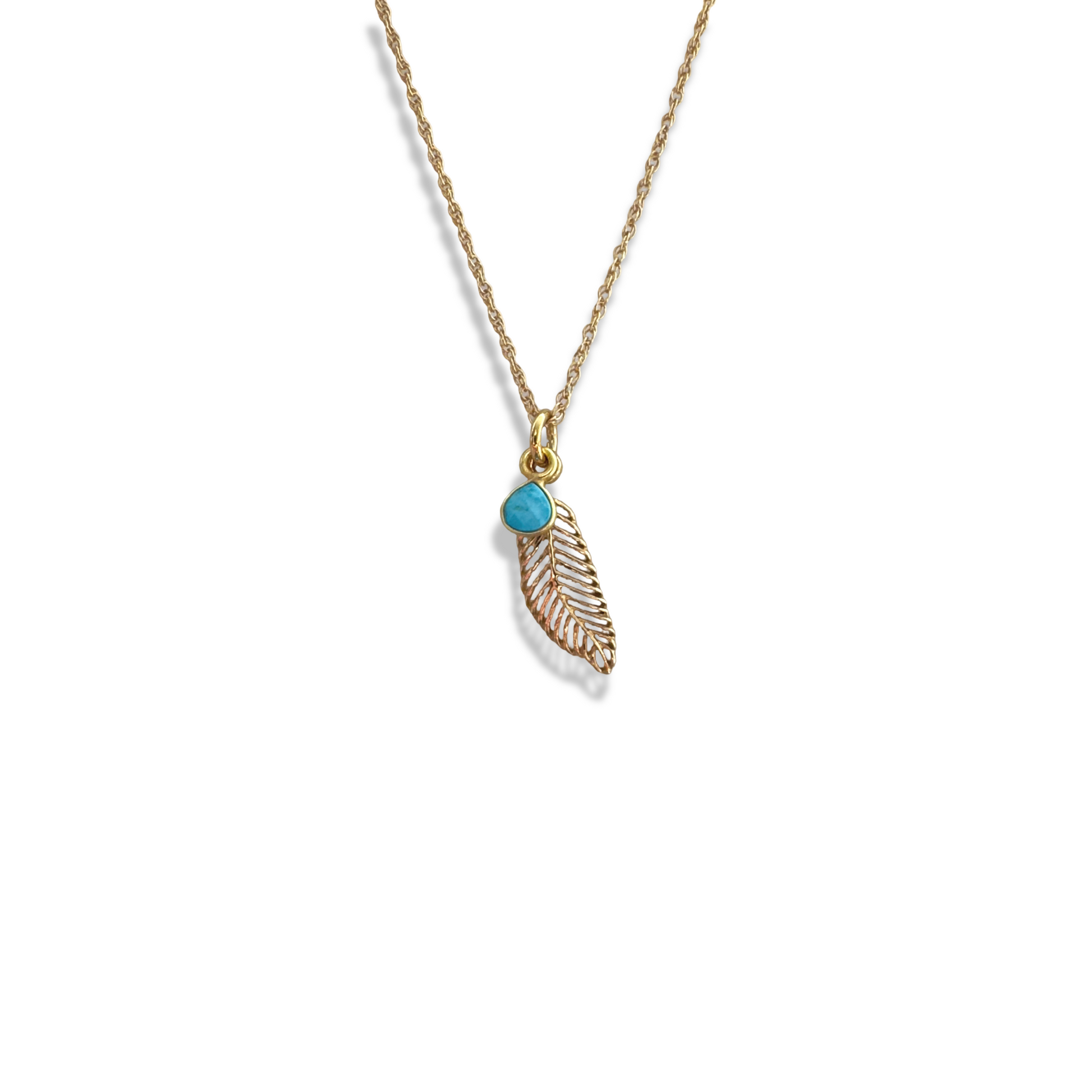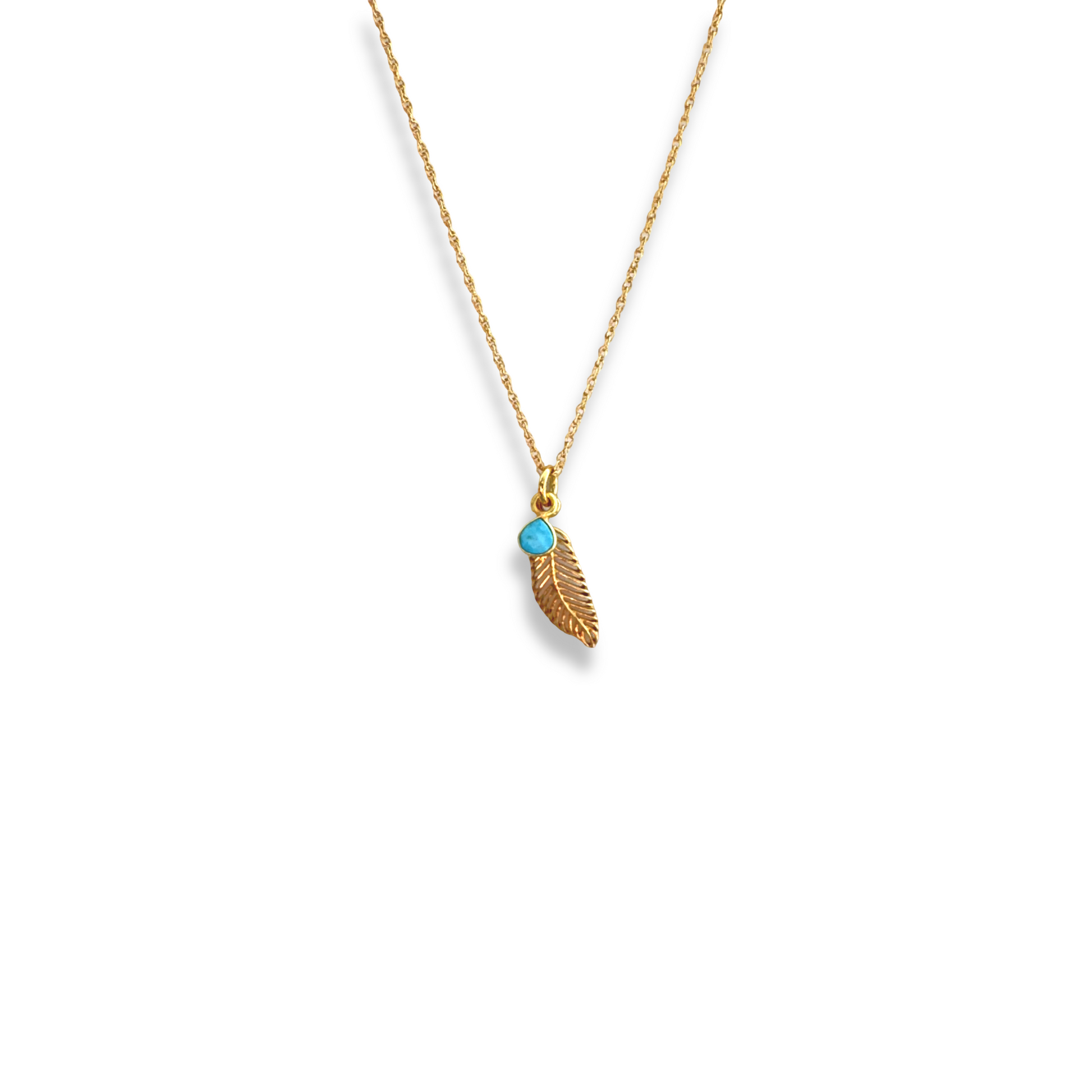 Gold vermeil feather with turquoise charm on a 14k gold filled 18" rope cable necklace