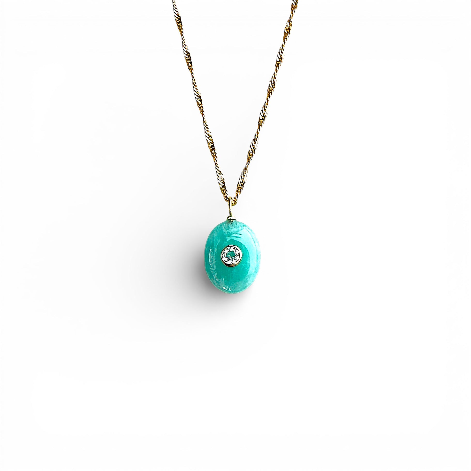 Amazonite oval pendant with a white topaz center stone on an 18k, 18" Singapore chain