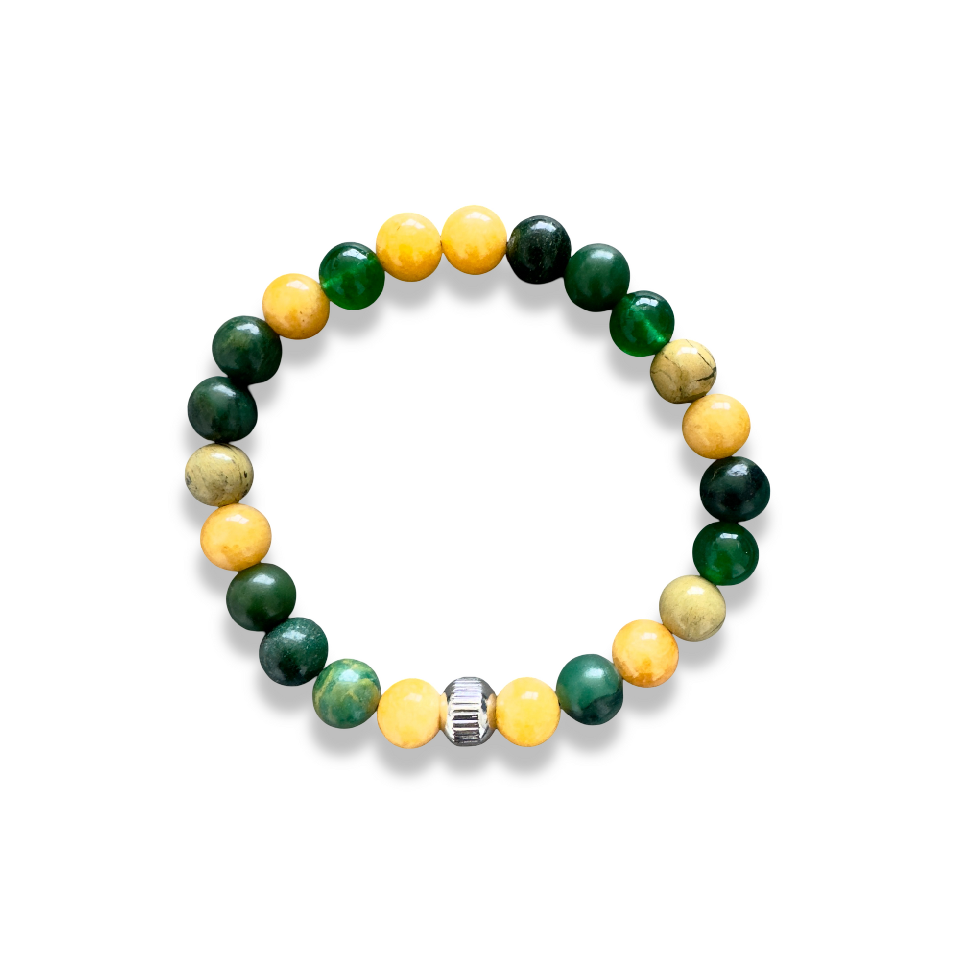 8mm African jade, zebra healerite, and green + yellow jade, with a stainless steel etched accent bead