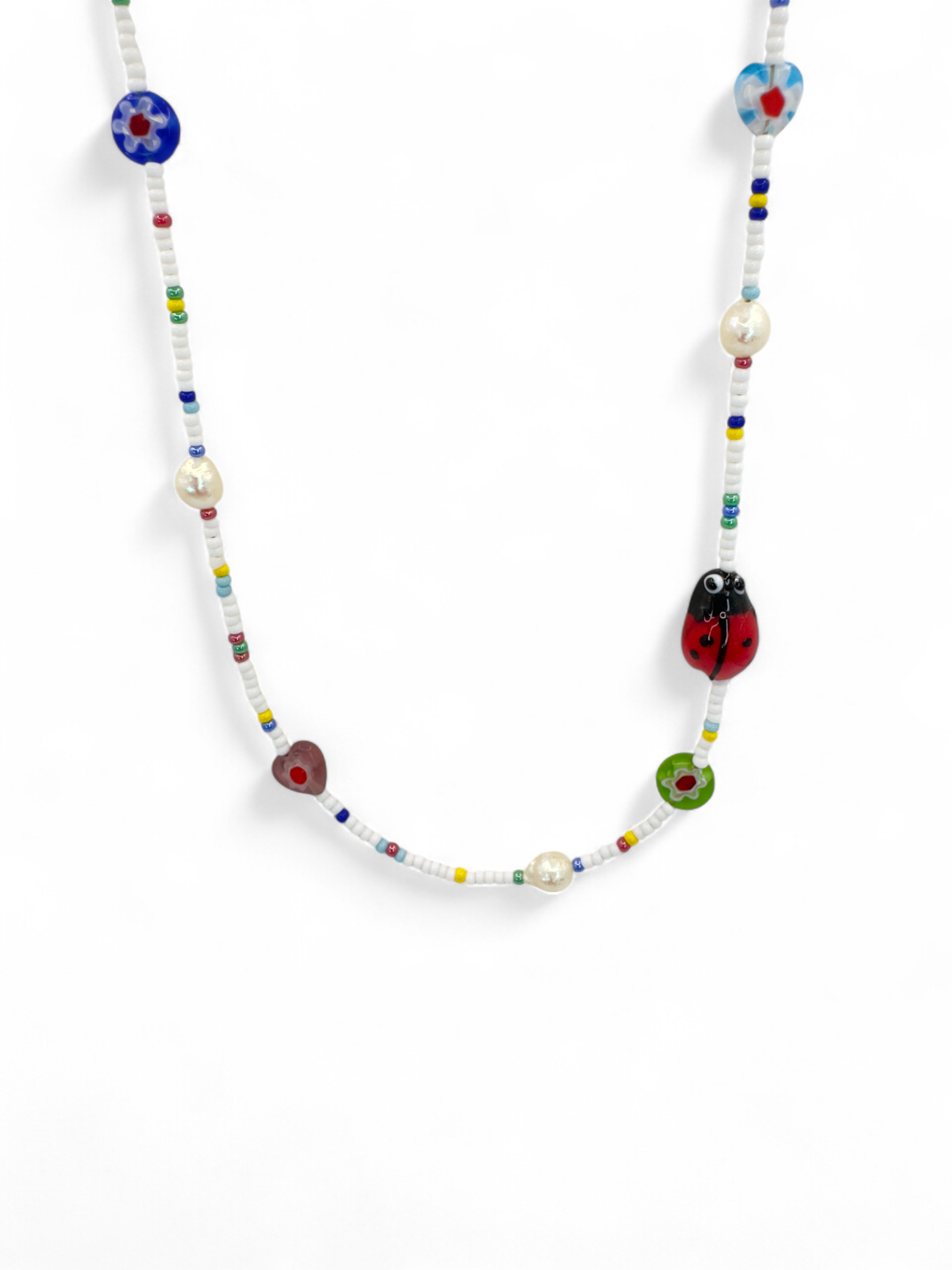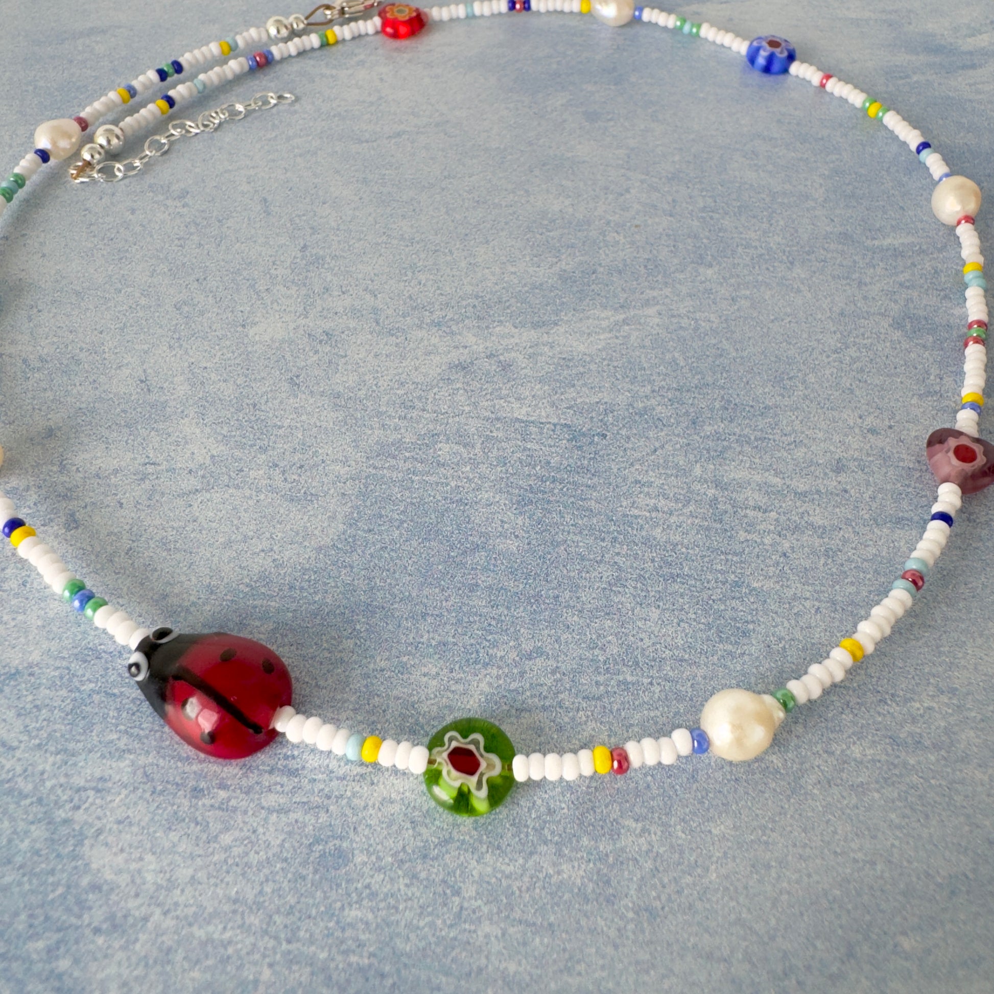 Mix of 2mm mixed color seed beads with freshwater pearls, murano glass charms, and a 14mm red glass ladybug charm, finished with sterling silver clasp and 2" sterling silver extender chain.