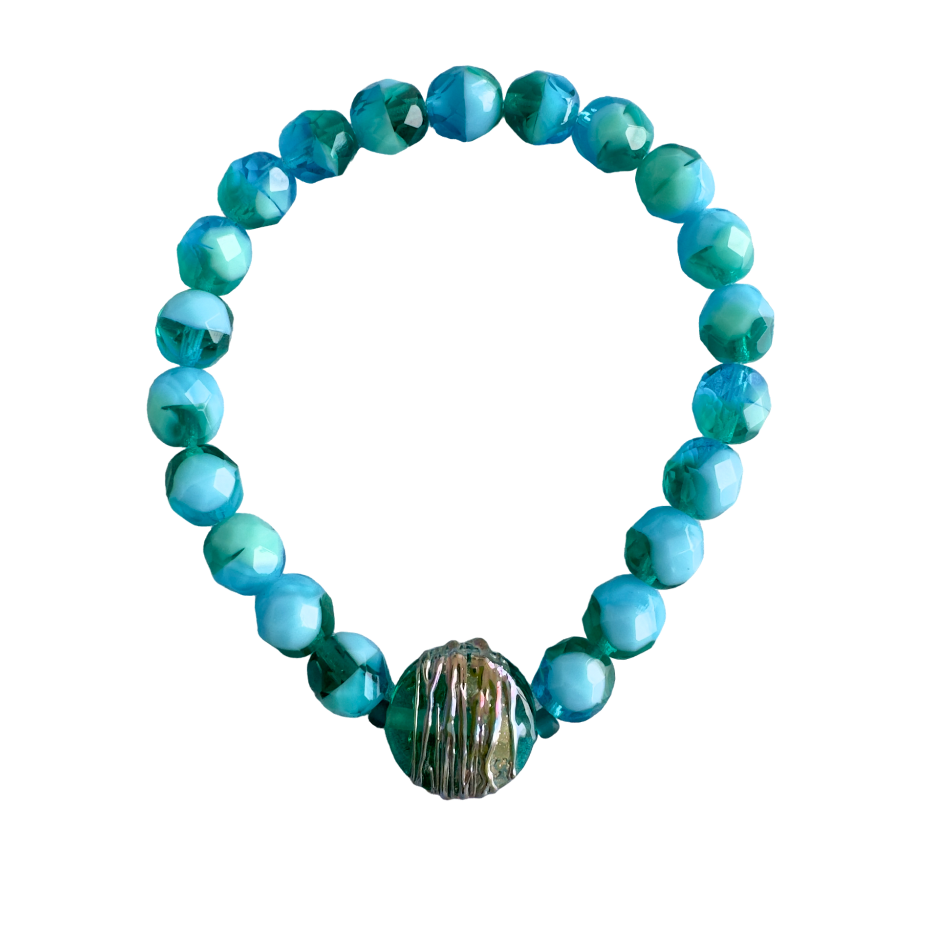 8mm aquamarine Czech glass fire polished beads with a 15mm teal czech glass coin bead.