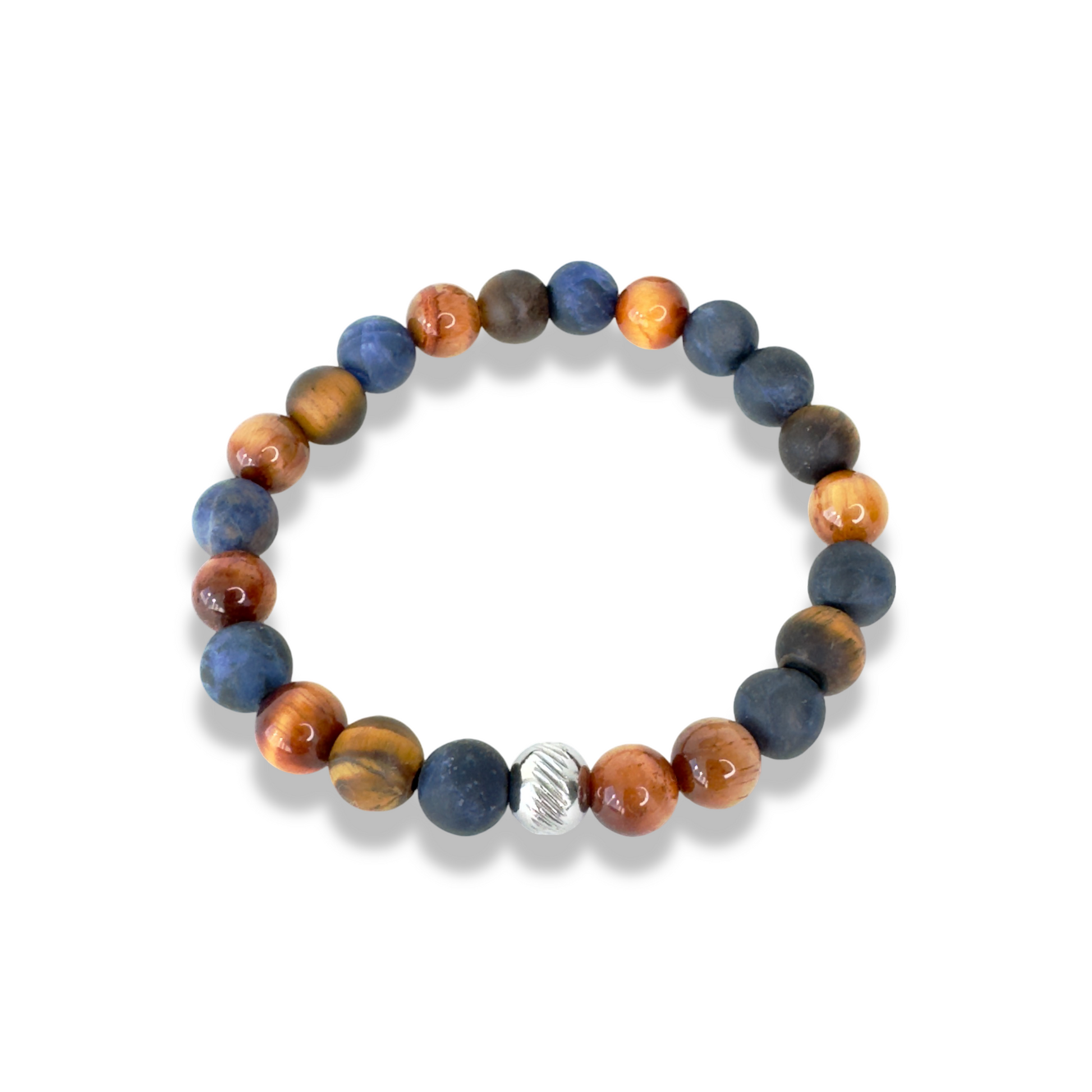 A mix of 8mm matte and polished tiger eye, 8mm matte lapis lazuli, and a stainless steel grooved accent.