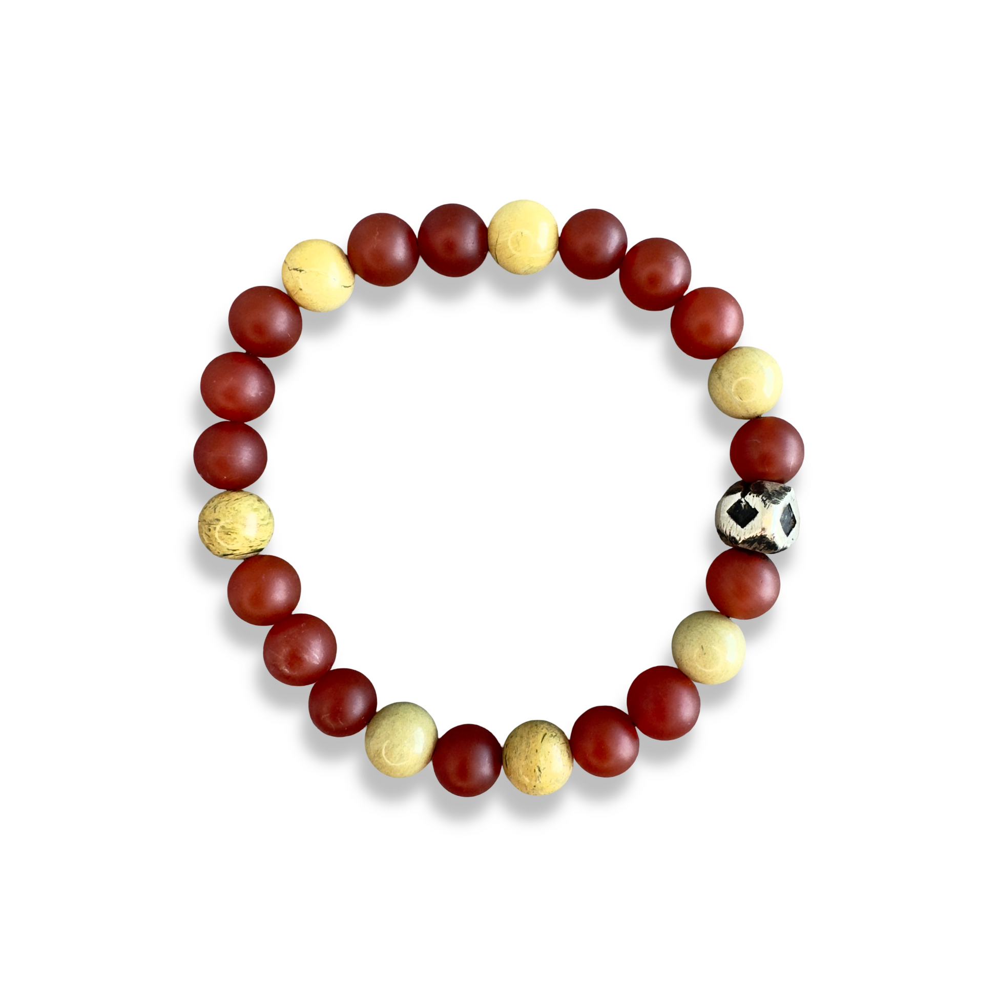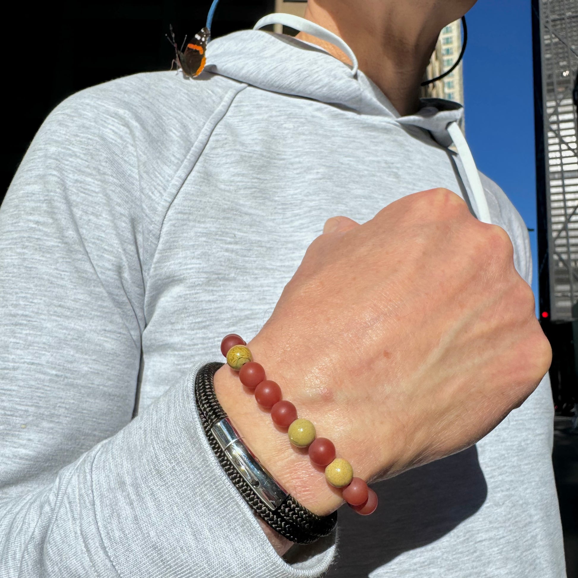 8mm dark red carnelian, matte, and 8mm zebra healerite green, smooth, with an accent bronze bead