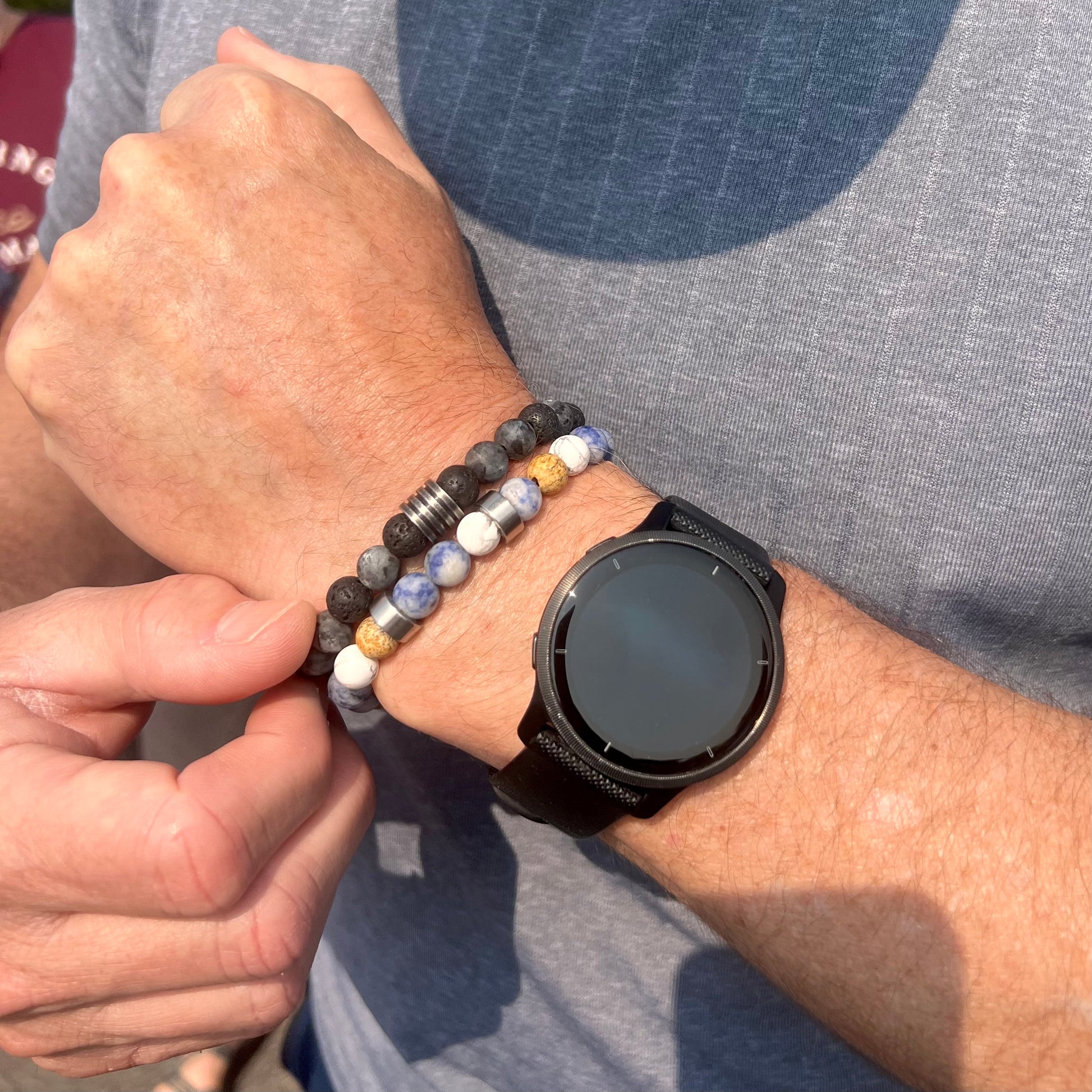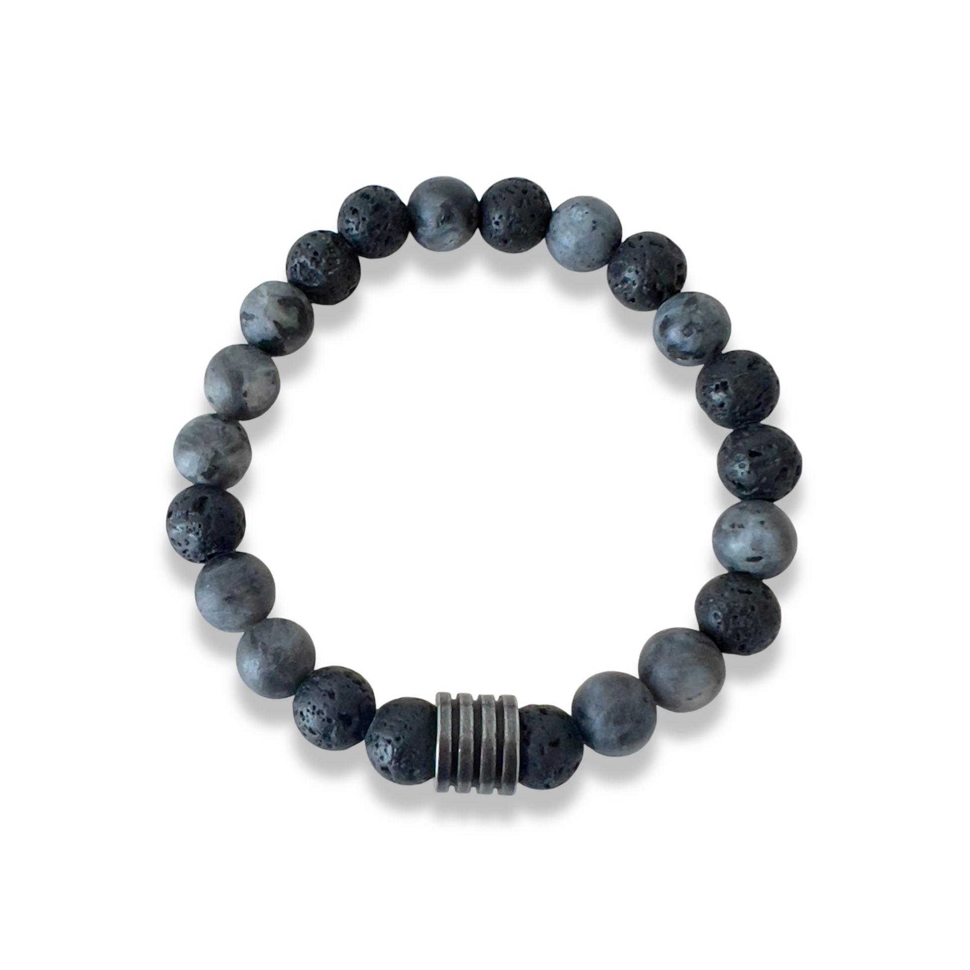 8mm black lava rock and matte larvikite, round, with a gunmetal alloy grooved tube.