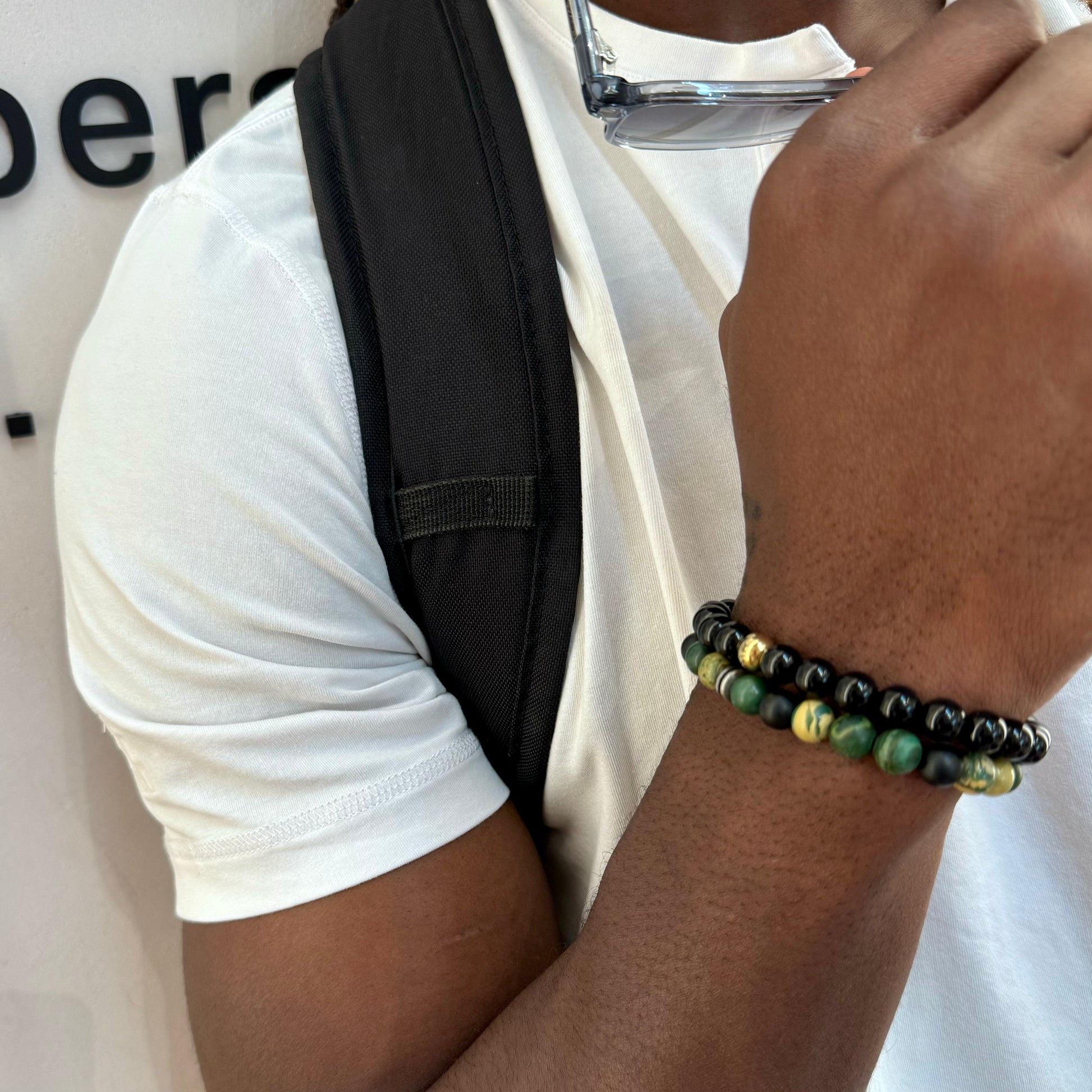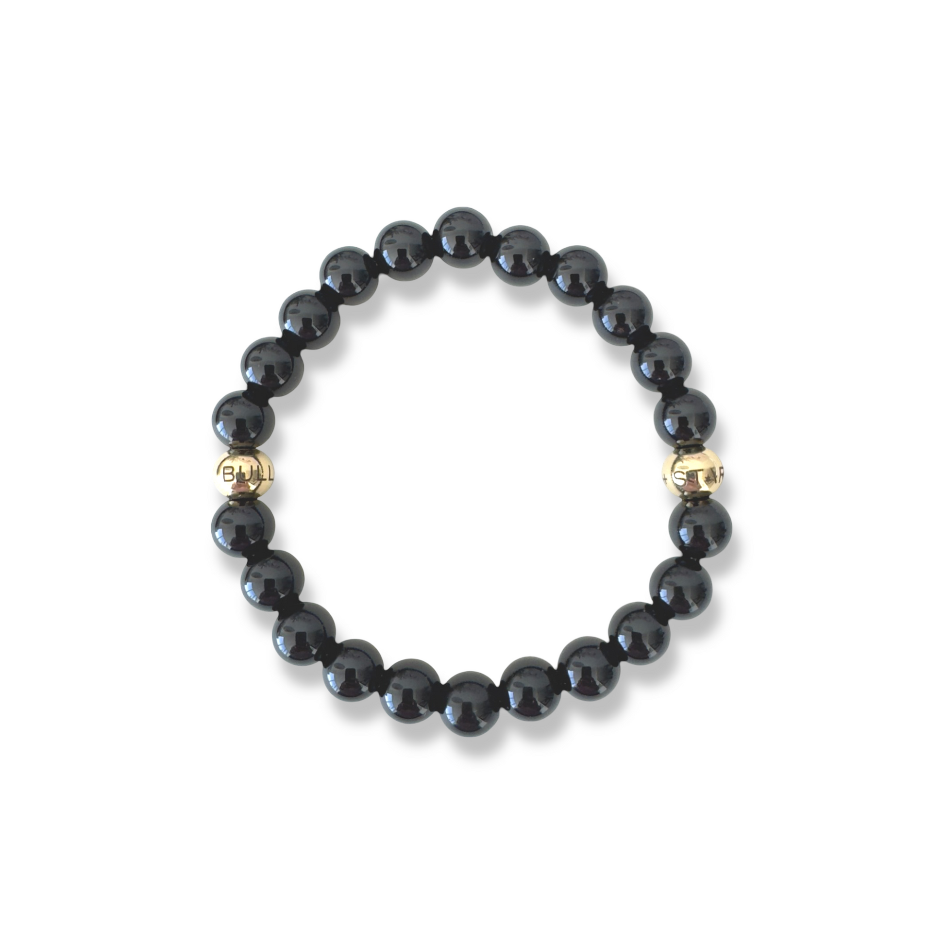 8mm black onyx beads and 2 gold stainless steel BULL + STAR beads