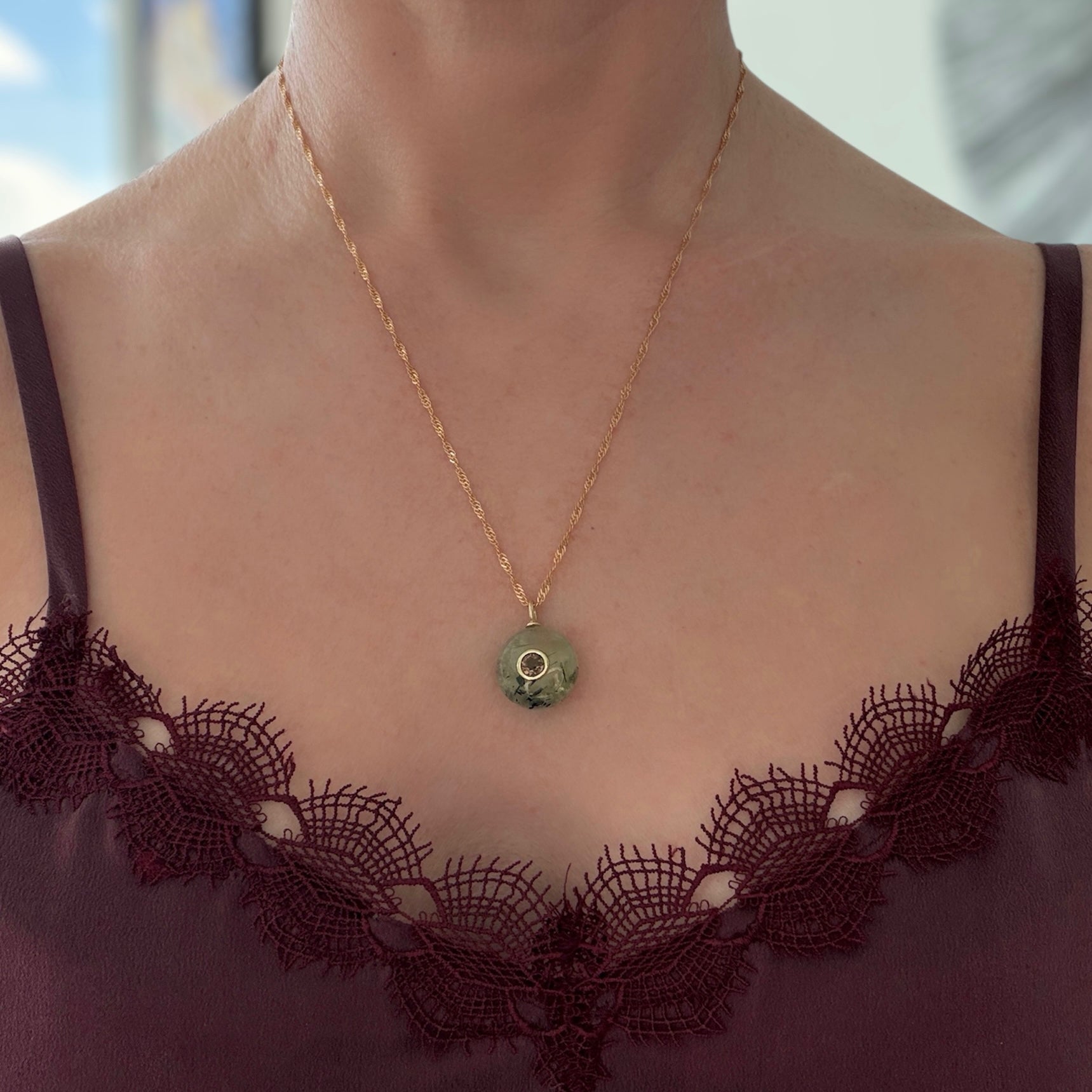 Prehnite round pendant with a smoky quartz center stone on an 18k, 18" Singapore chain