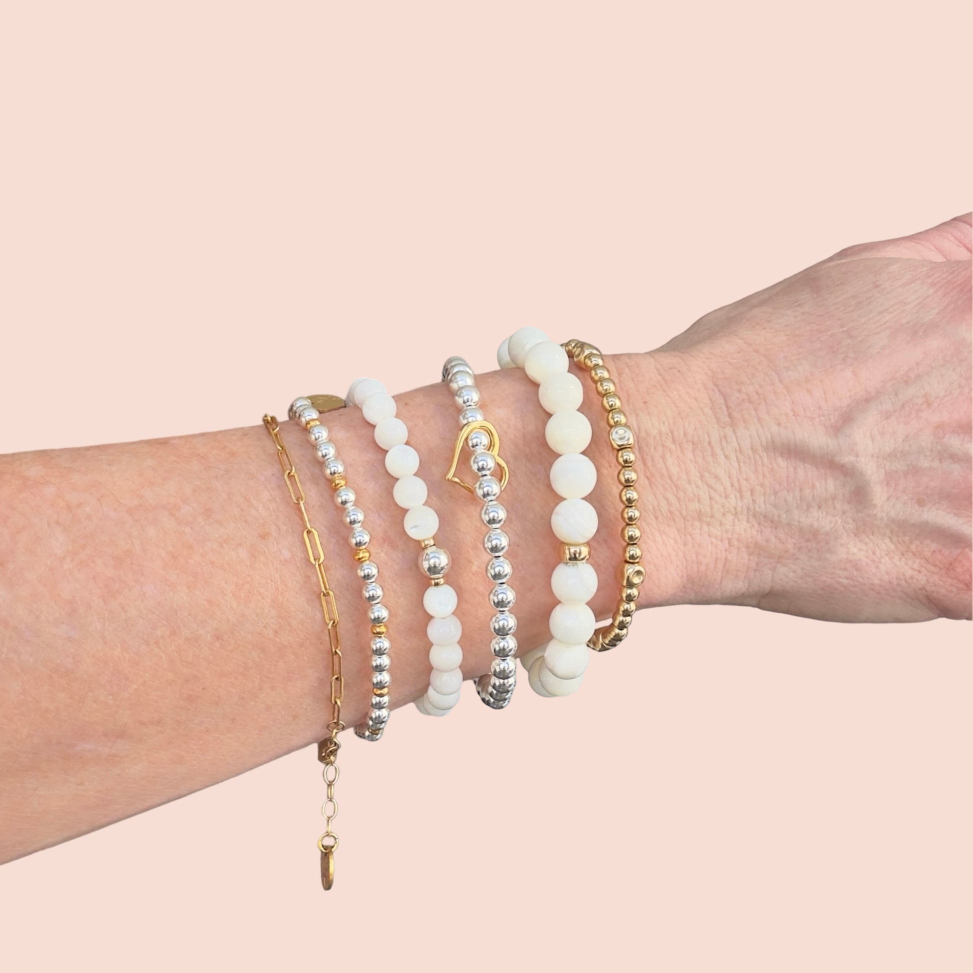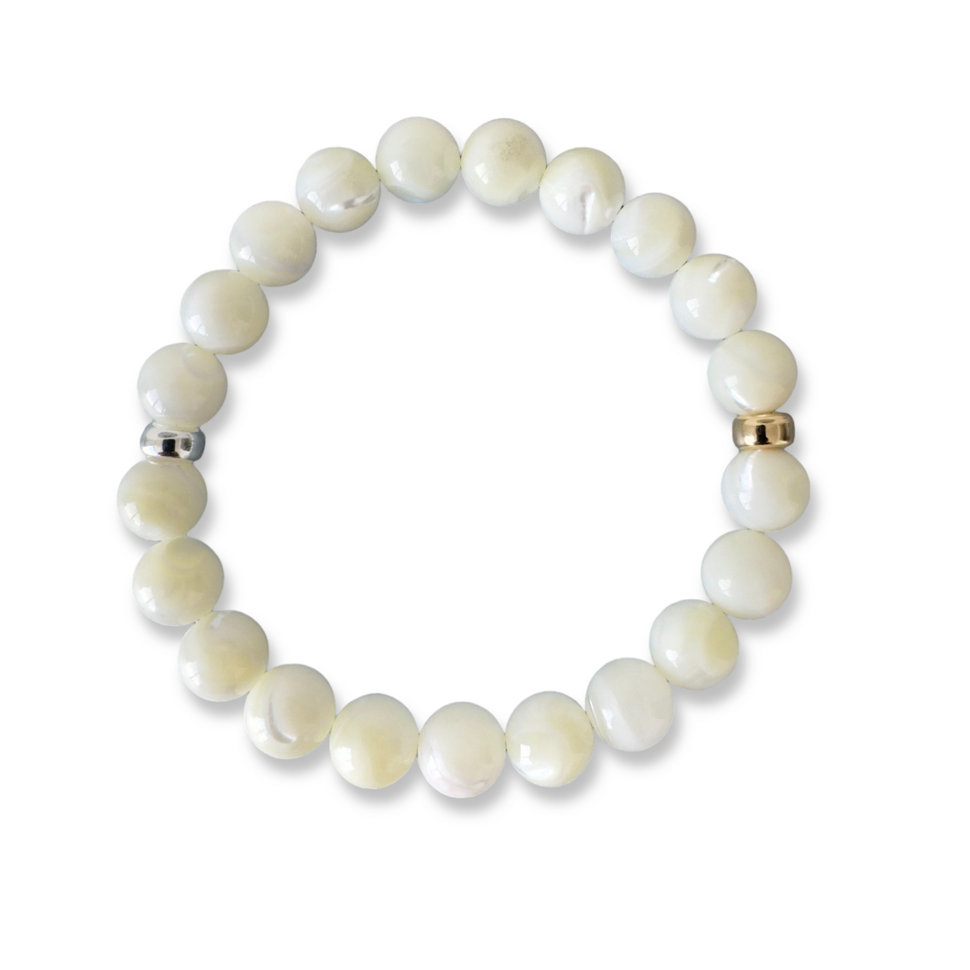 8mm iridescent mother of pearl shell rounds with a gold filled rondelle and a sterling silver rondelle