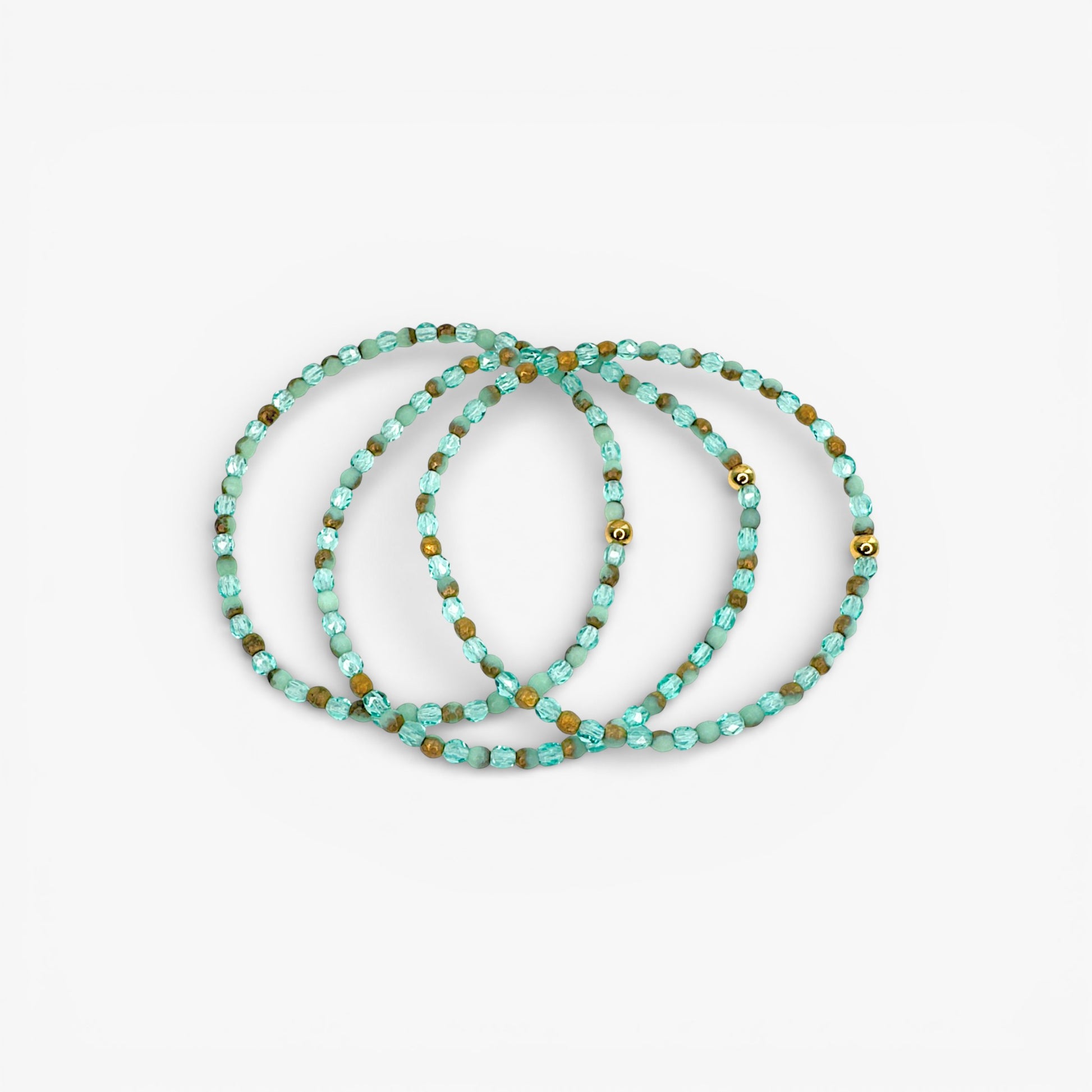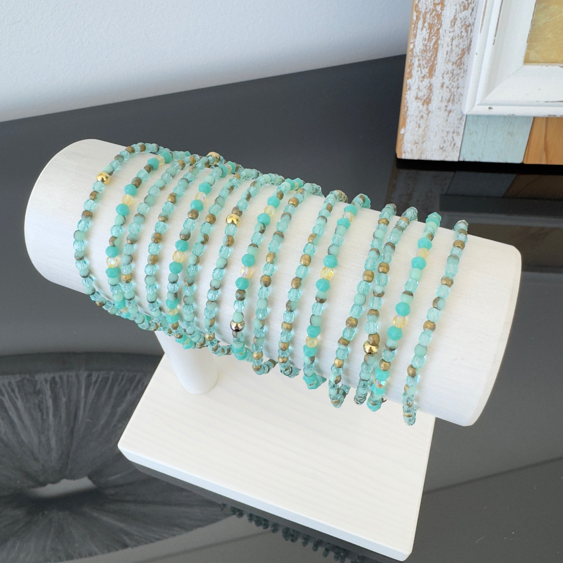 3-4mm shades of teal and gold flecked teal Czech glass beads. Three bracelets included.