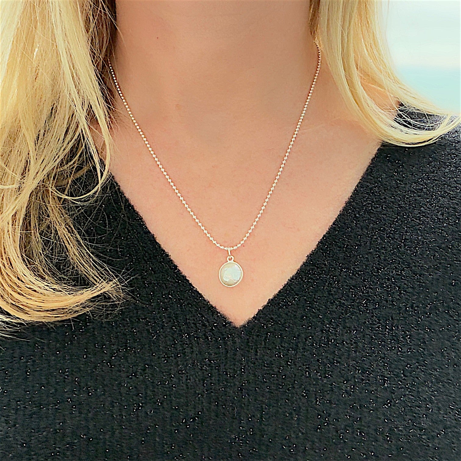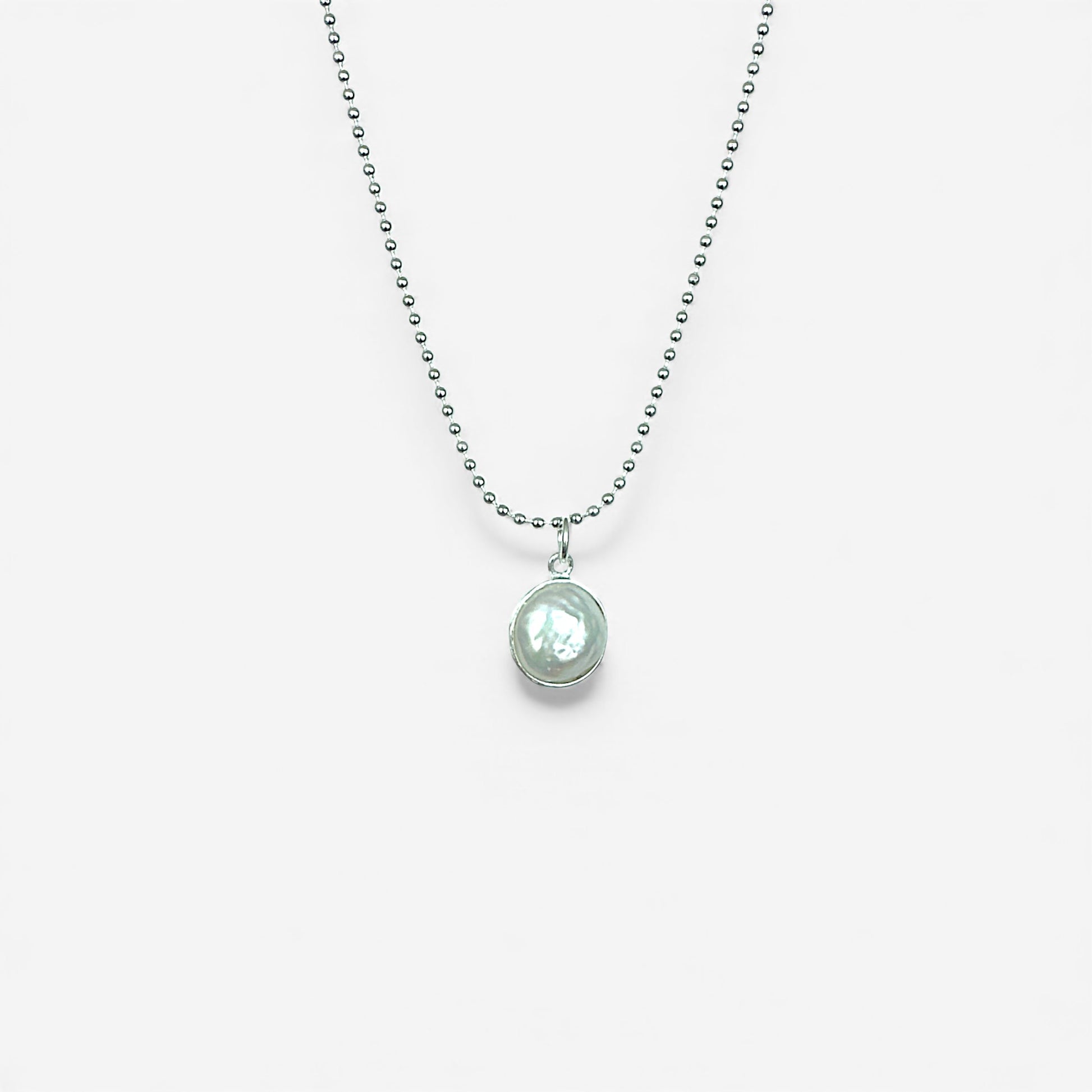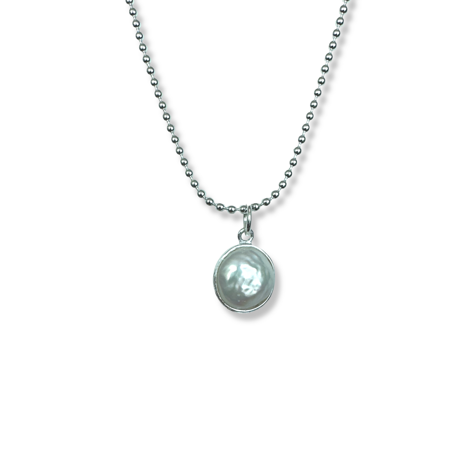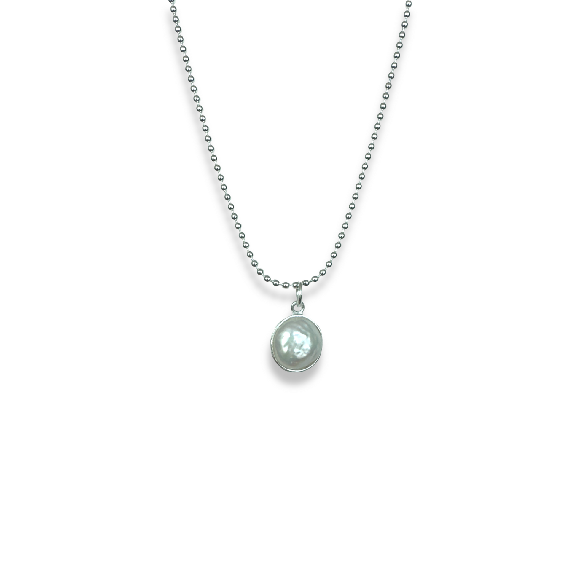 Sterling silver 18" ball chain necklace with an 11mm freshwater pearl, bezel set, pendant