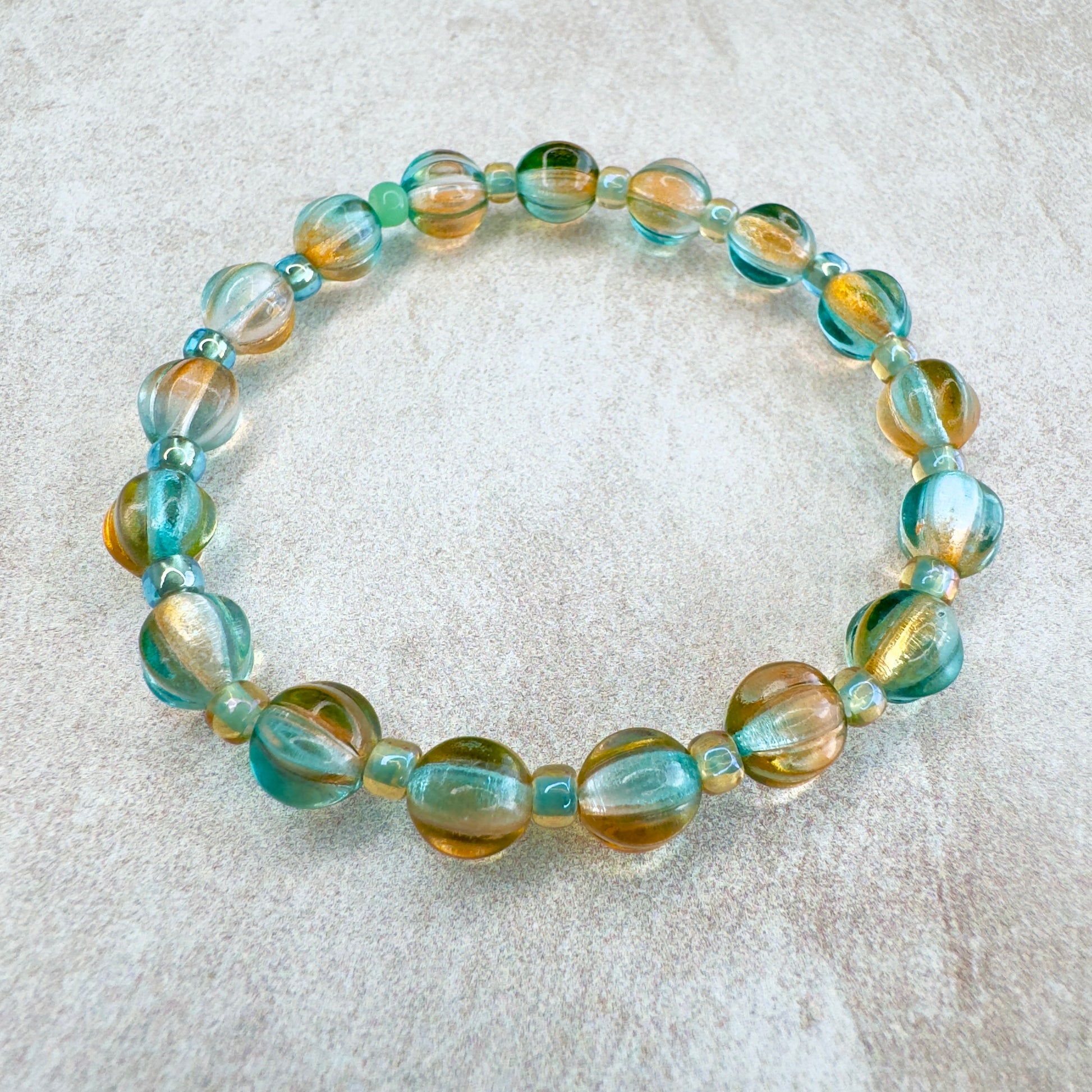 8mm Czech glass melon rounds, dual coated blue-green/ orange with blue-green seed beads