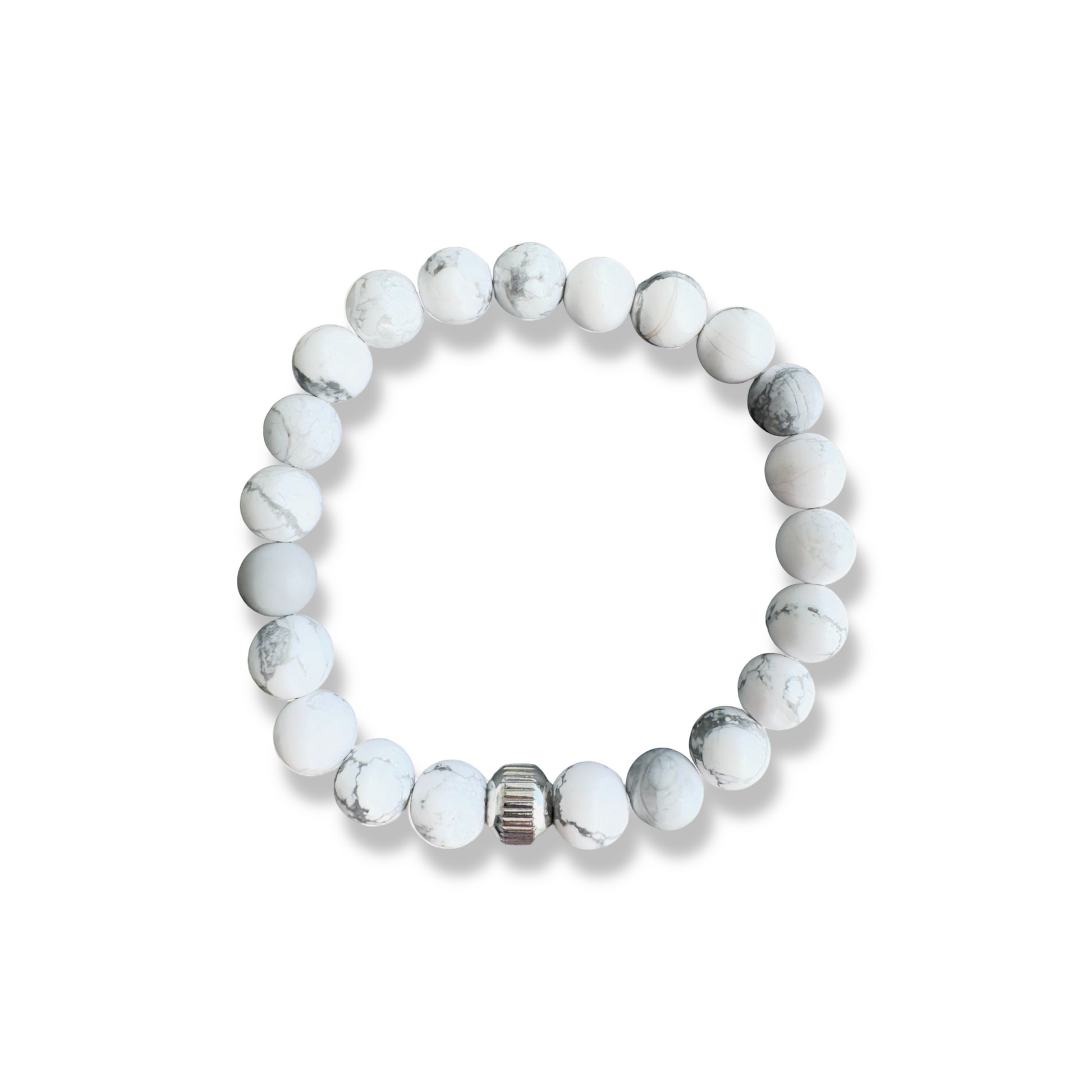 8mm matte white howlite, round, and an 8mm stainless steel grooved bead